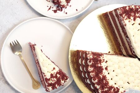 Կարմիր, շոկոլադի հիմքով թավշյա բիսկվիտի շերտեր, պանրային և կաթնային կրեմների համադրություն: Նախատեսված է առնվազն (8 անձի) համար