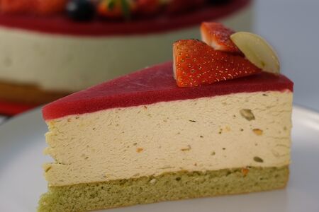 Պիստակի հիմքով բարակ բիսկվիտային շերտեր, պիստակի մածուկով նուրբ մուսային շերտ, ծածկված է ազնվամորու դոնդողային շերտով
