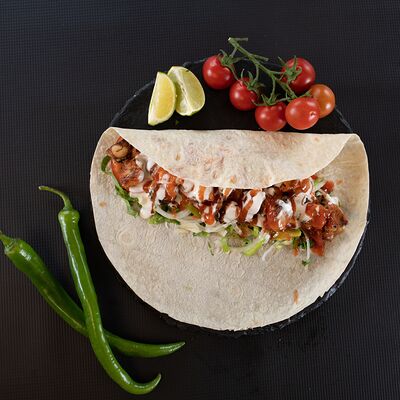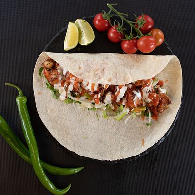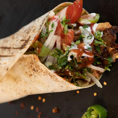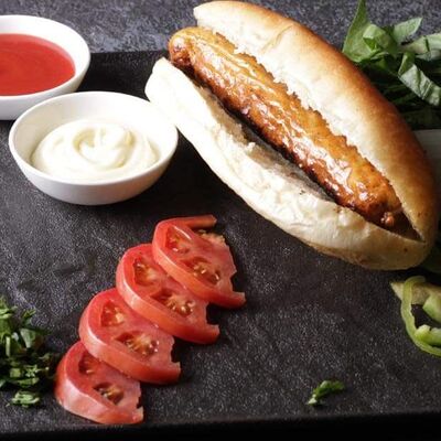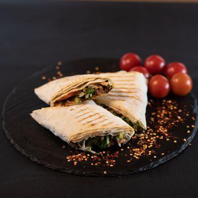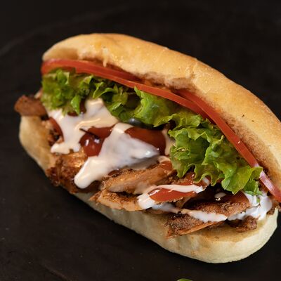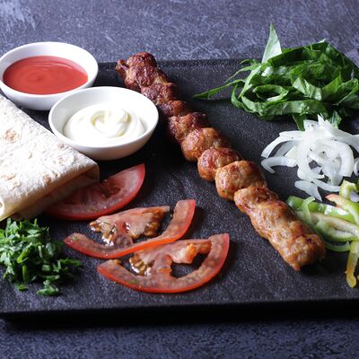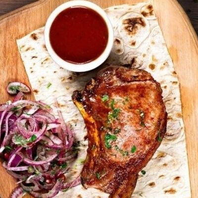 Свинина, лошик, соленые огурцы, помидоры, лук, зелень, сыр, соус мачете, картофель фри