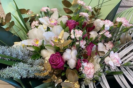 Օրխիդեա, վարդ, հոլանդական մեխակ, արեգա, էվկալիպտ, դեկորատիվ բամբակ (60 սմ)