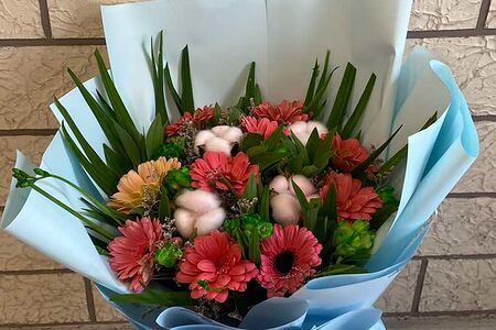 Ֆրեզիա, գերբերա, դեկորատիվ բամբակ, չափսը (40x50 սմ)