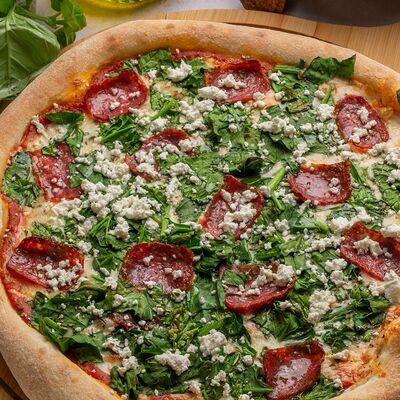 Томатный соус для пеллет, моцарелла, шпинат, салями, творог, орегано (32 см)