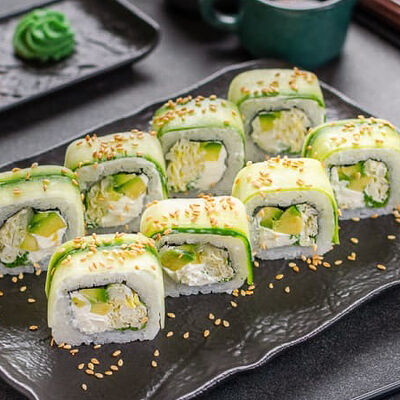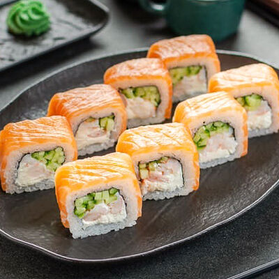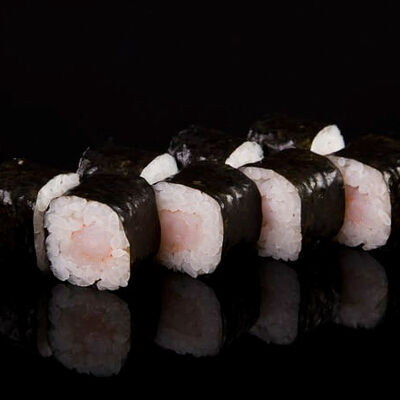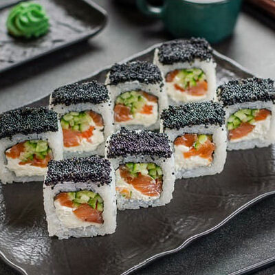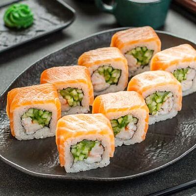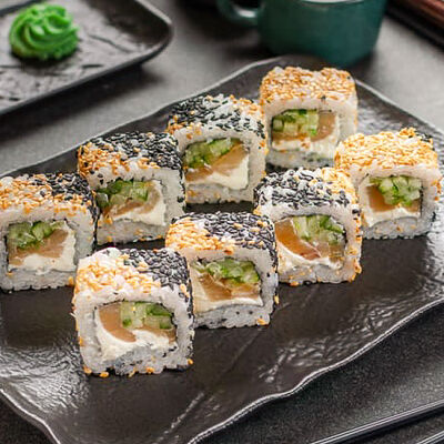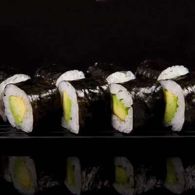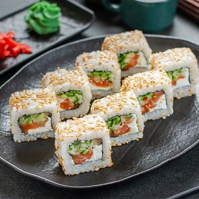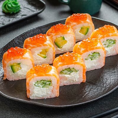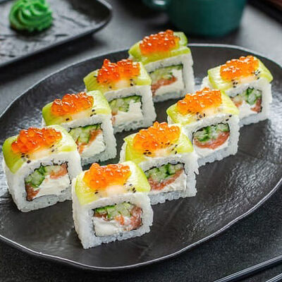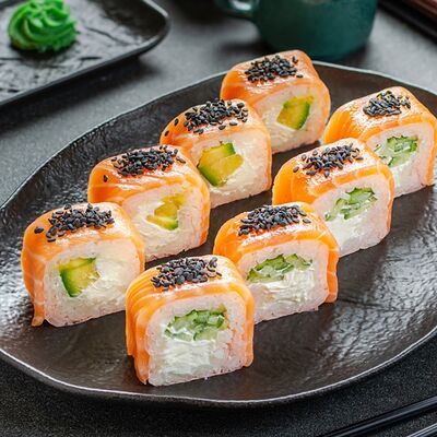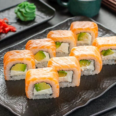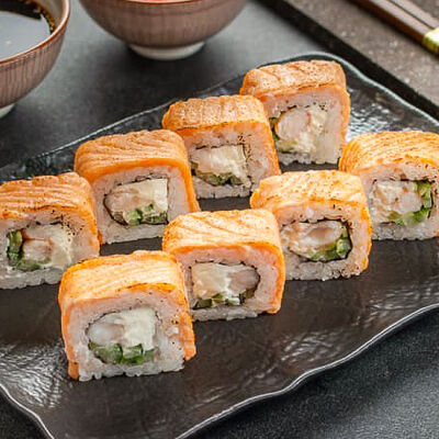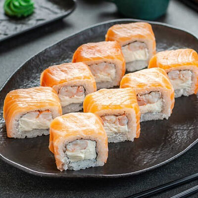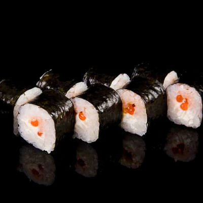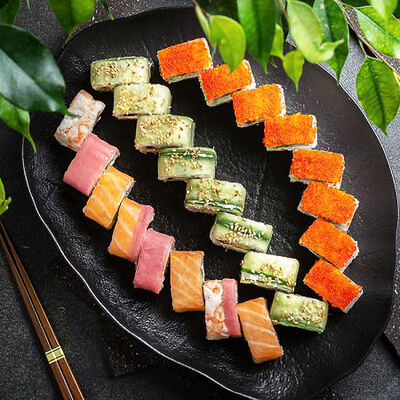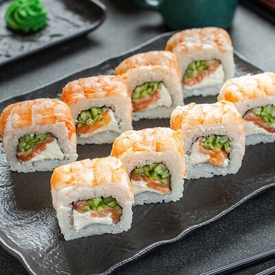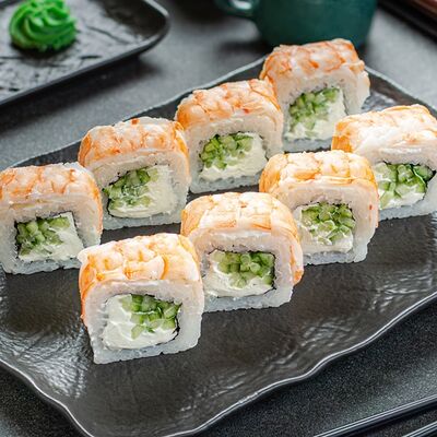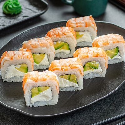 Нори, рис, креветки, тунец, лосось, авокадо, огурец, сыр