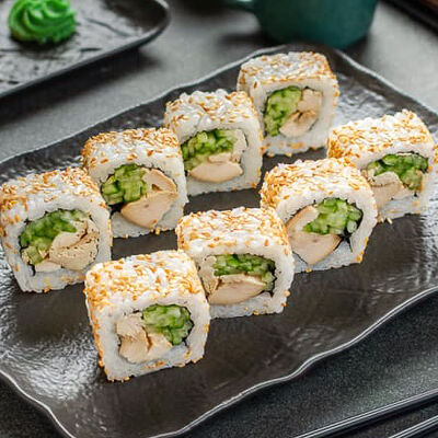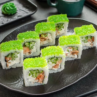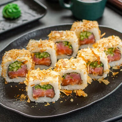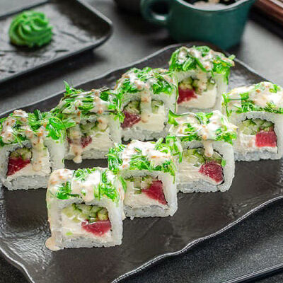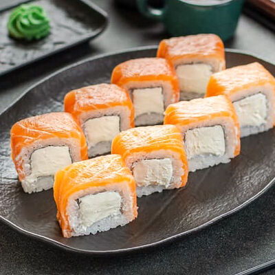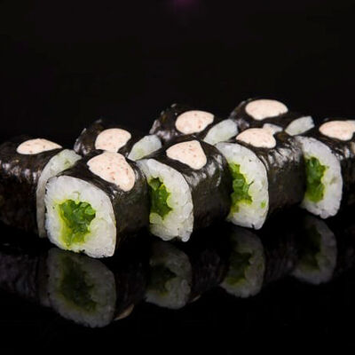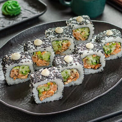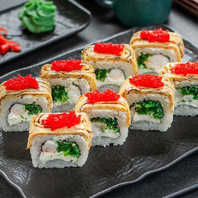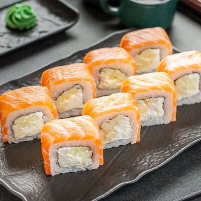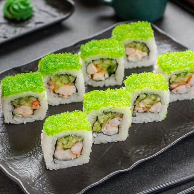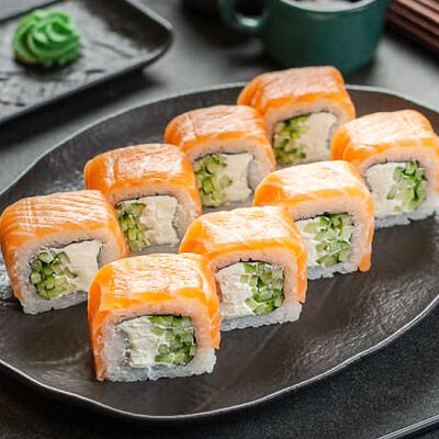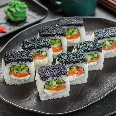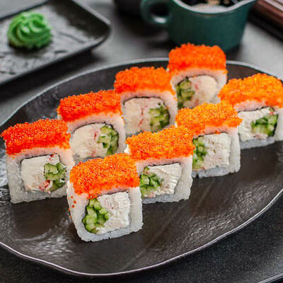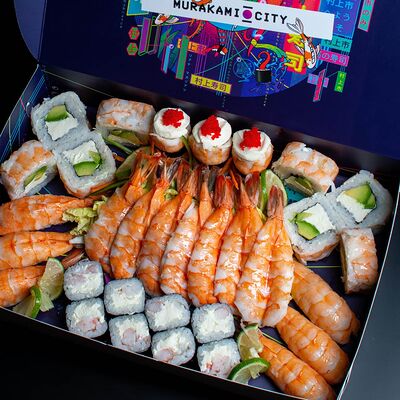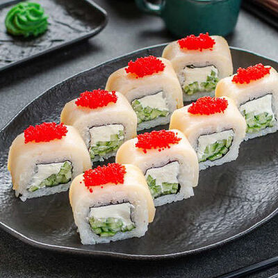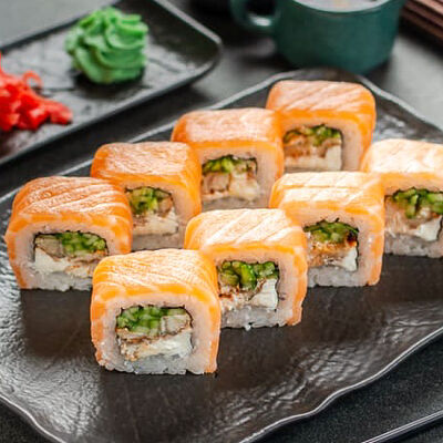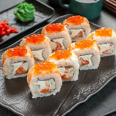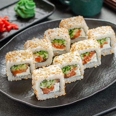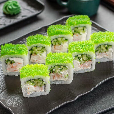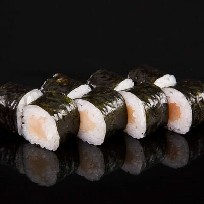Нори, рис, креветки, тунец, лосось, авокадо, огурец, сыр