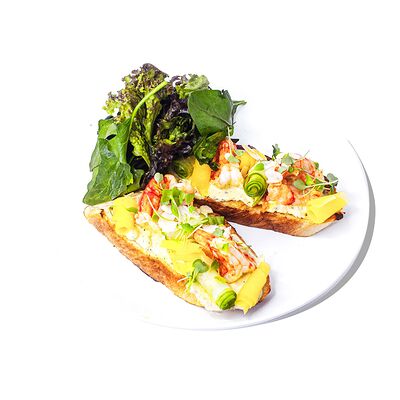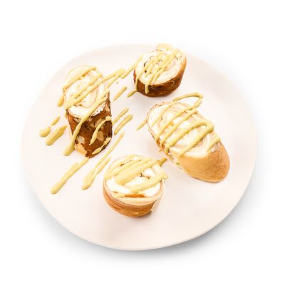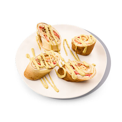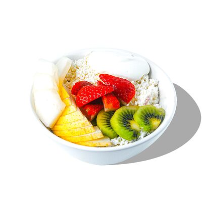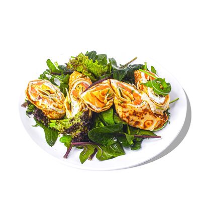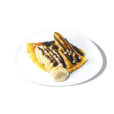 Блин с кокосовым молоком, банан, ананас, клубника, сливочный сыр, соус манго, масло перечной мяты
