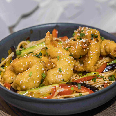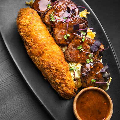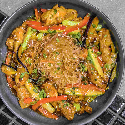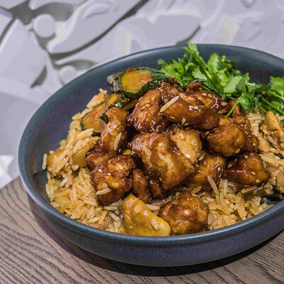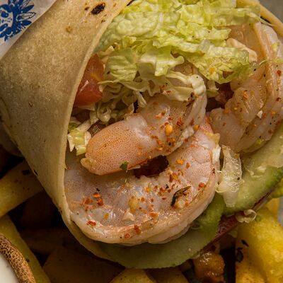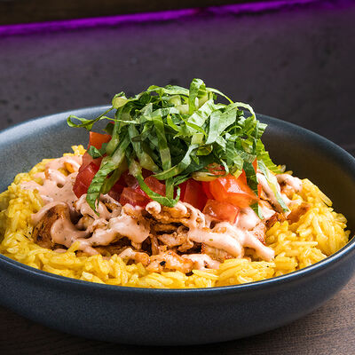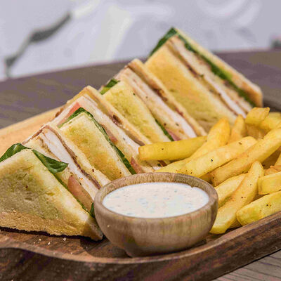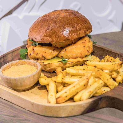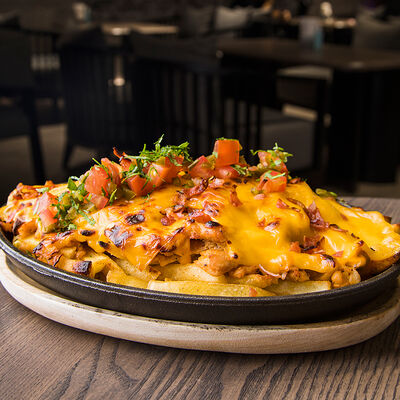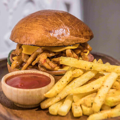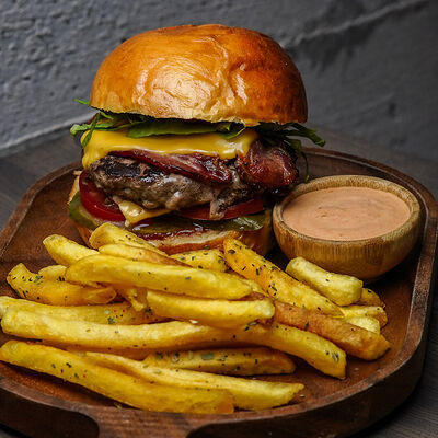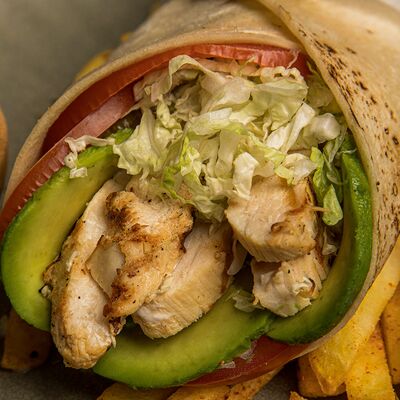 Куриное филе, салат, помидоры, сыр, картофель фри