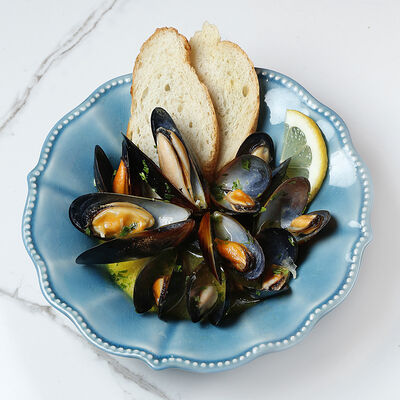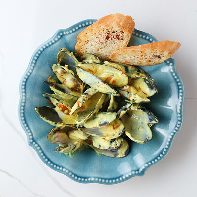 Мидии, томатный соус, петрушка, сухарики