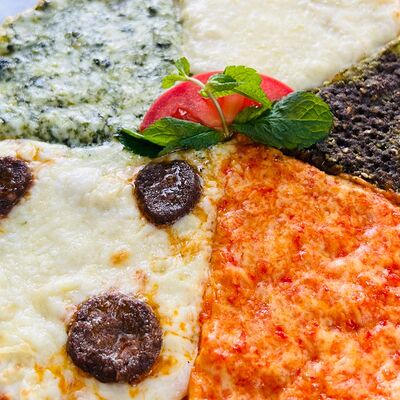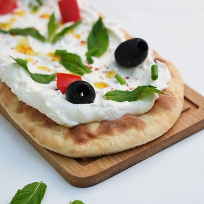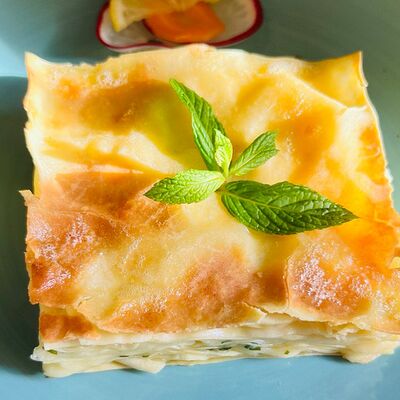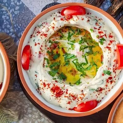Лодочки из хрустящего теста со шпинатом, подается с томатным соусом, йогуртом и чесноком