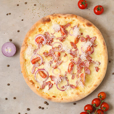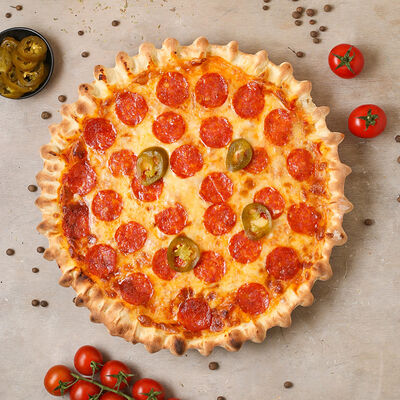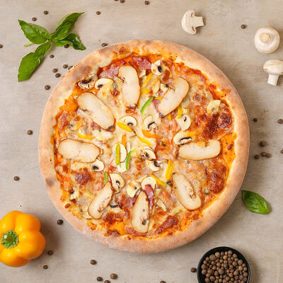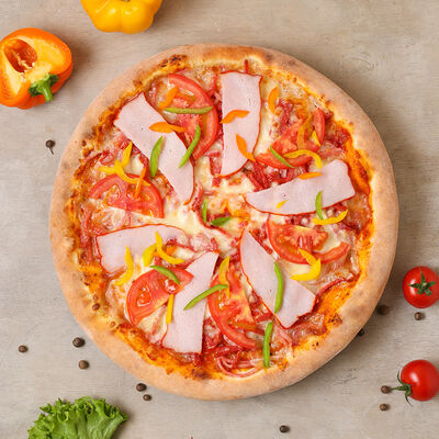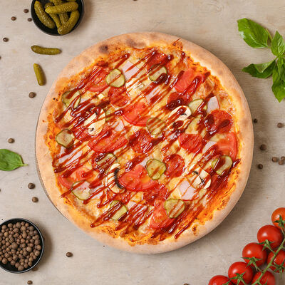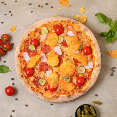 Чипсы, пепперони, ветчина, помидоры черри, маринованный огурец, моцарелла, соус пелати (33 см)