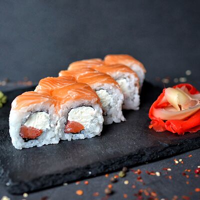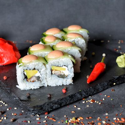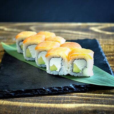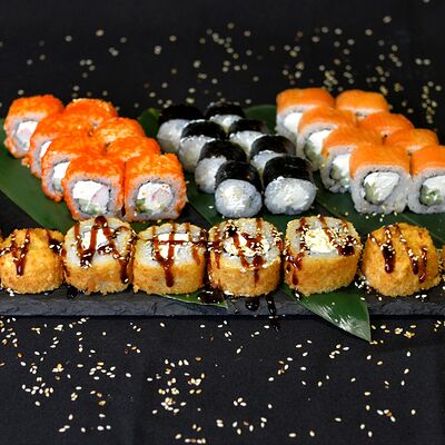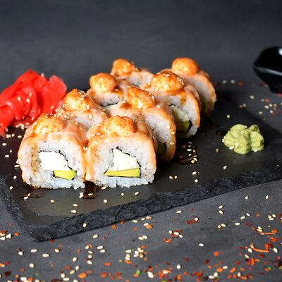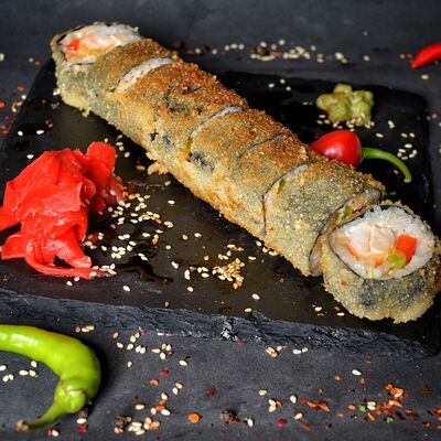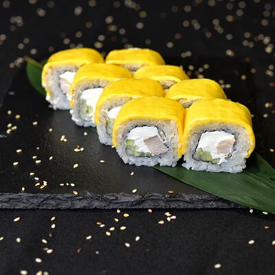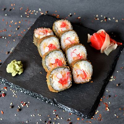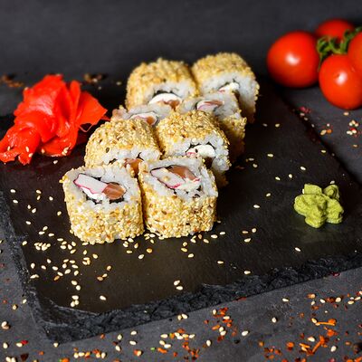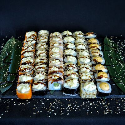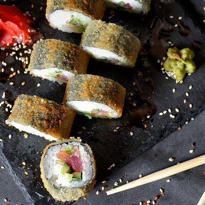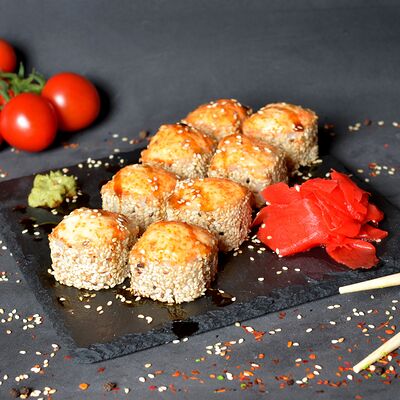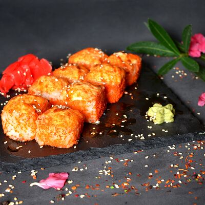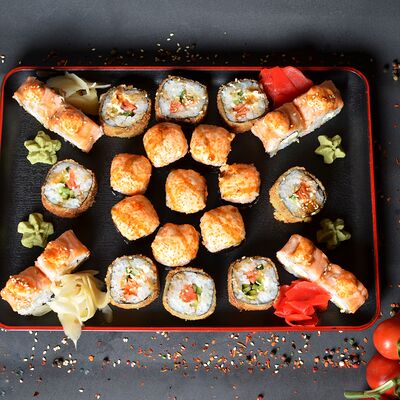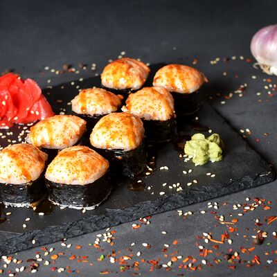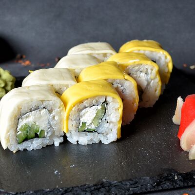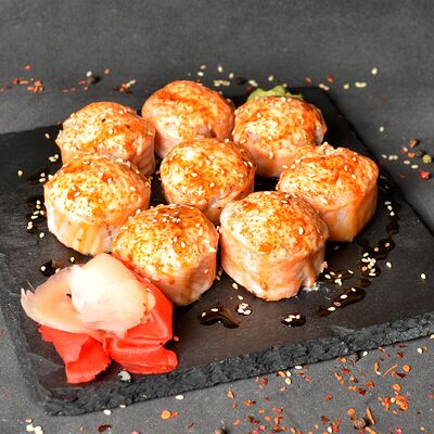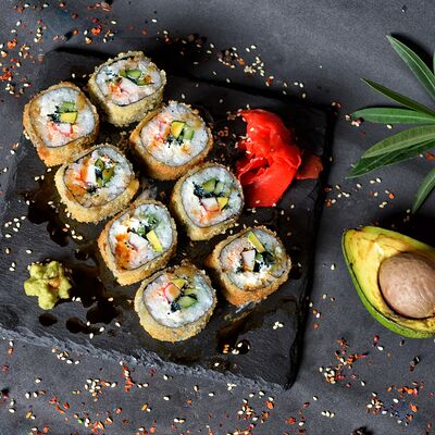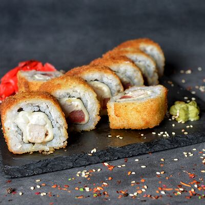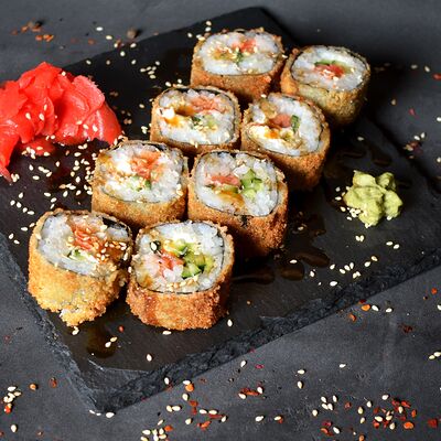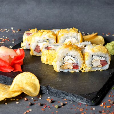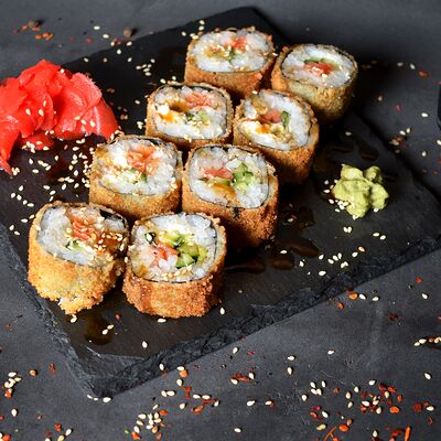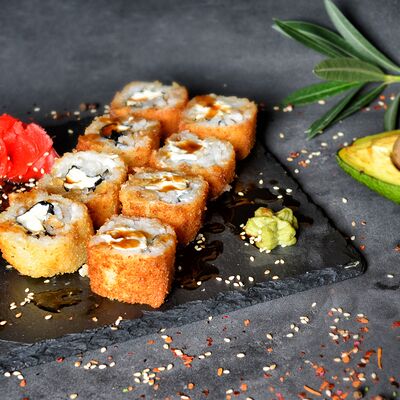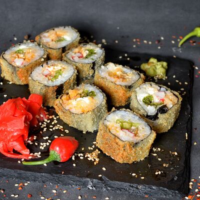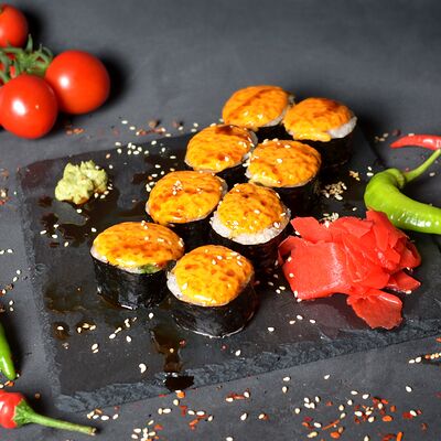 Запеченный ролл Филадельфия, запеченный ролл Калифорния, запеченный ролл спайси сумоку, чиз темпура, Кани темпура, Сяке темпура, Чикен чиз темпура