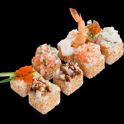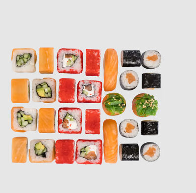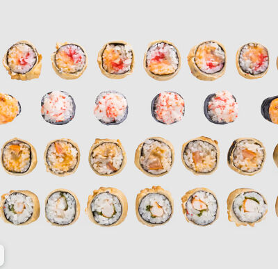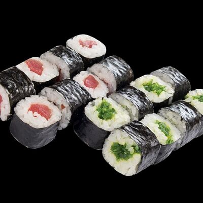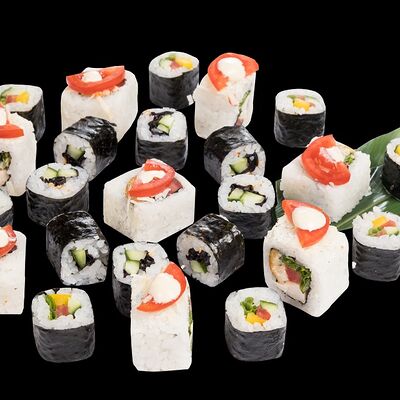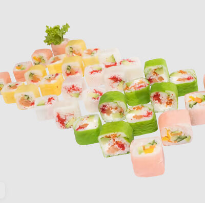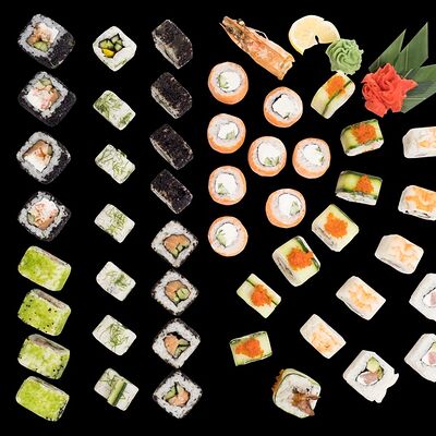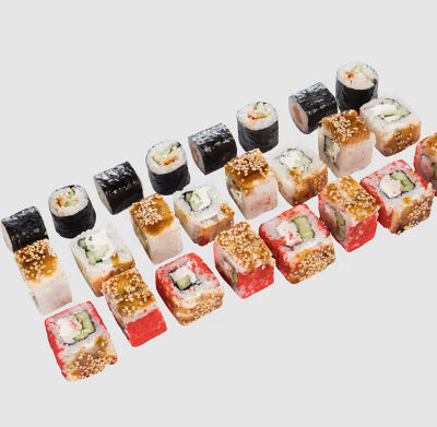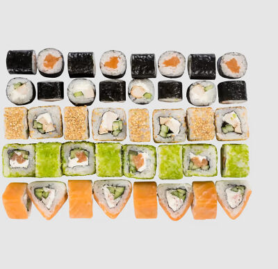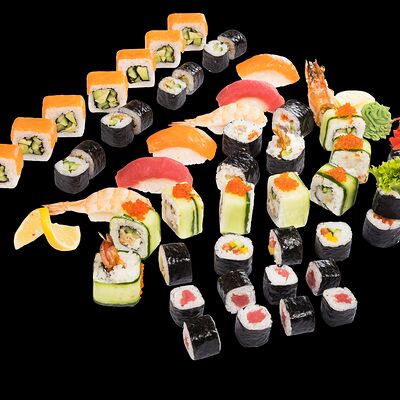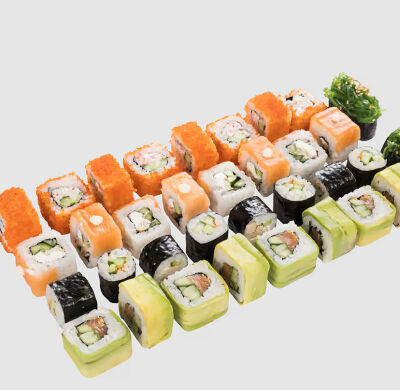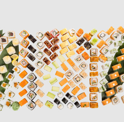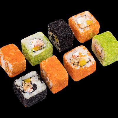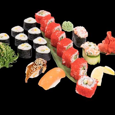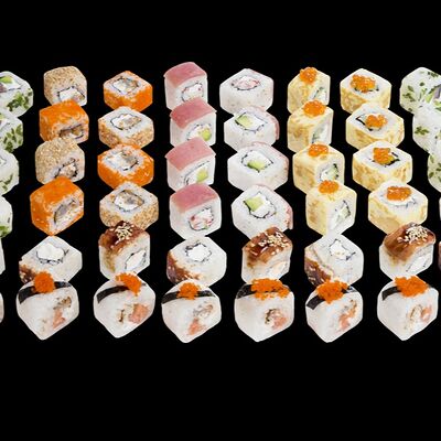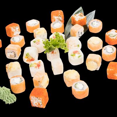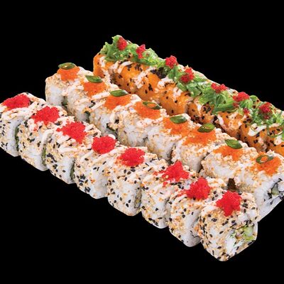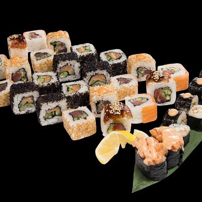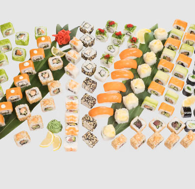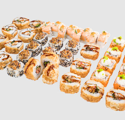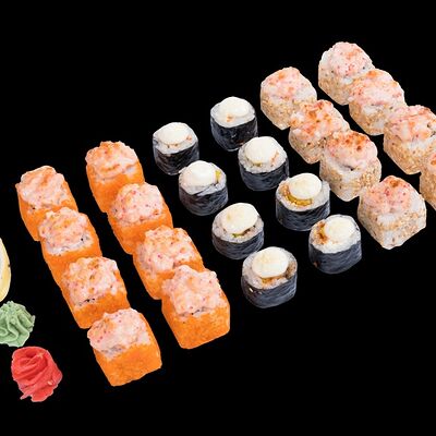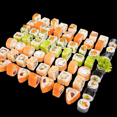 Роллы: Красный дракон, Зеленый дракон, Канада, тобико васаби, тобико Куро, Калифорния, Хотатегай, Сезам, Магуро (117 штук)