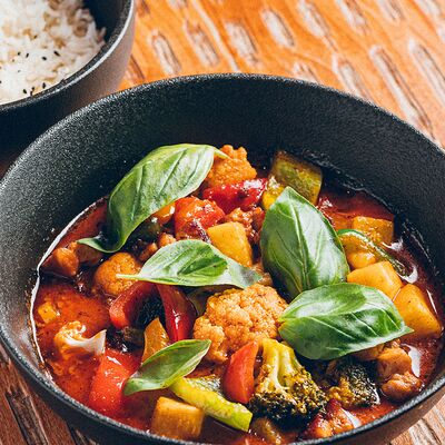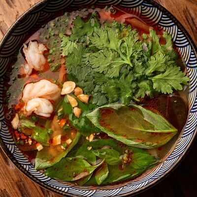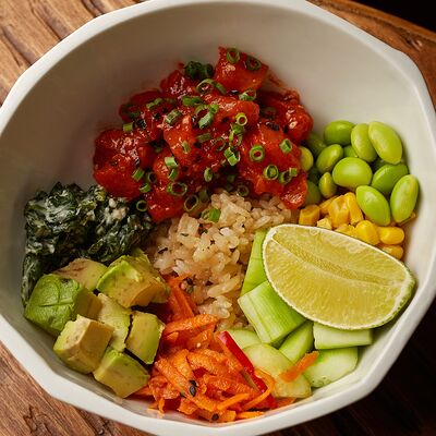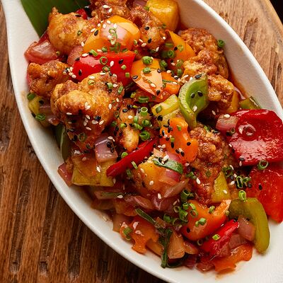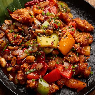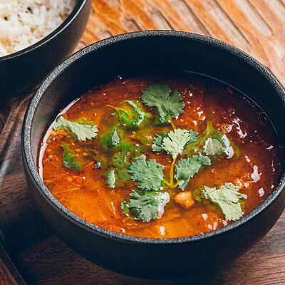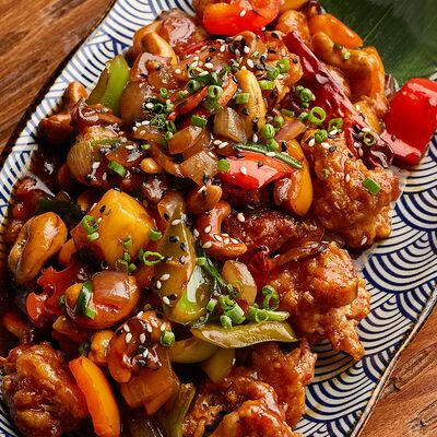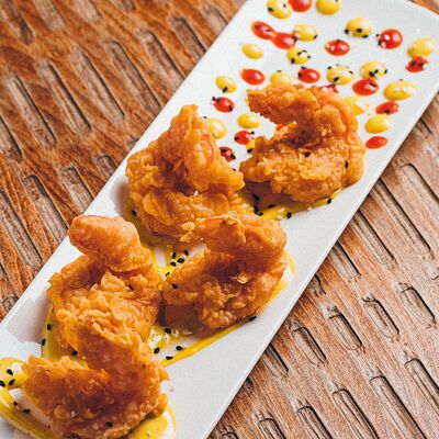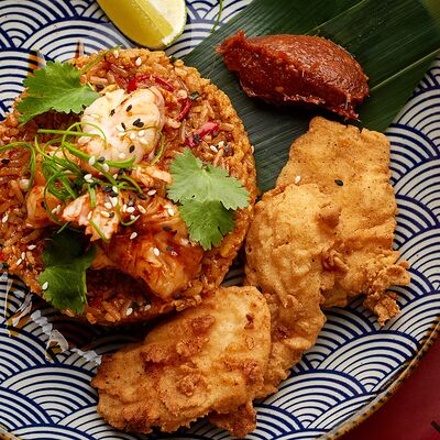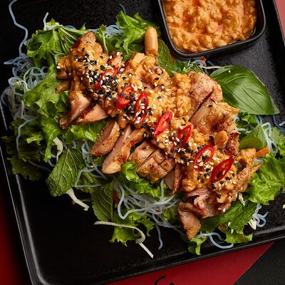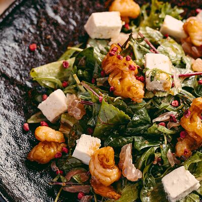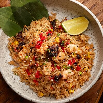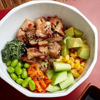 Рис, жареный цыпленок на кефире, свежая зелень, креветки на гриле, соус самбал