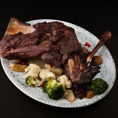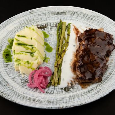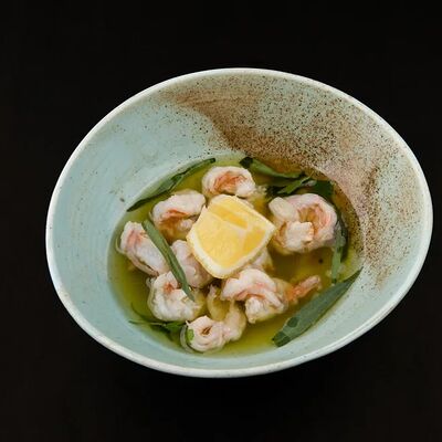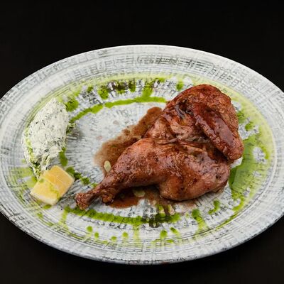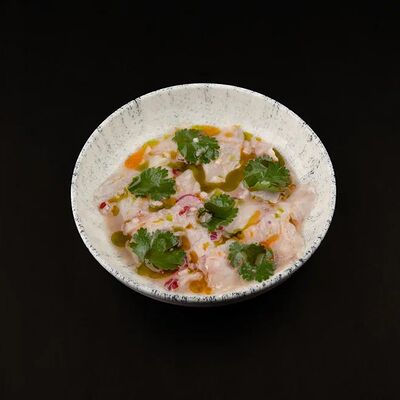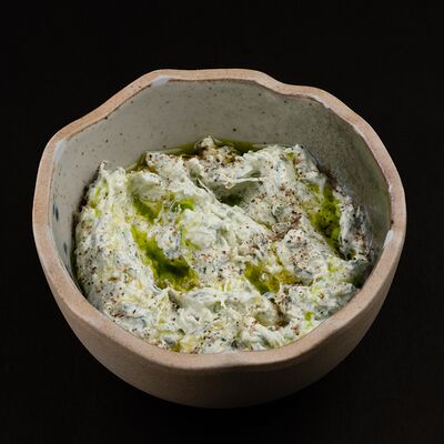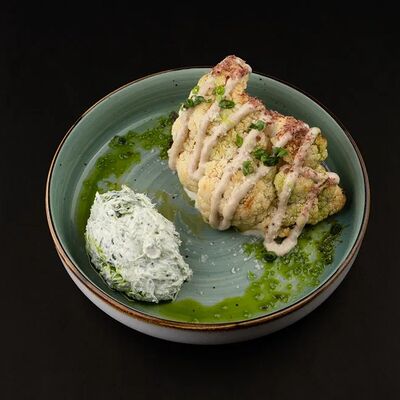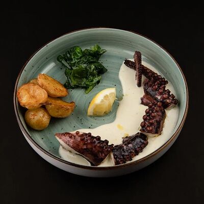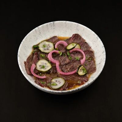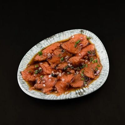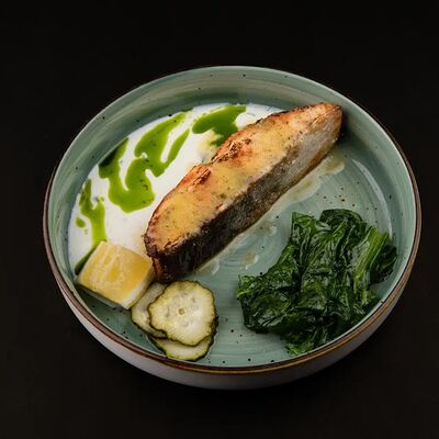 Лосось, соус комбу, стебель шпината, чеснок, соленые огурцы