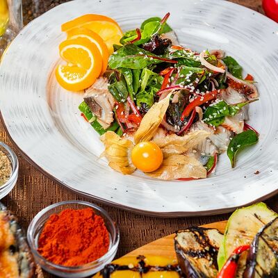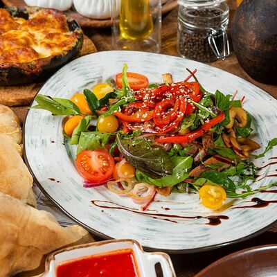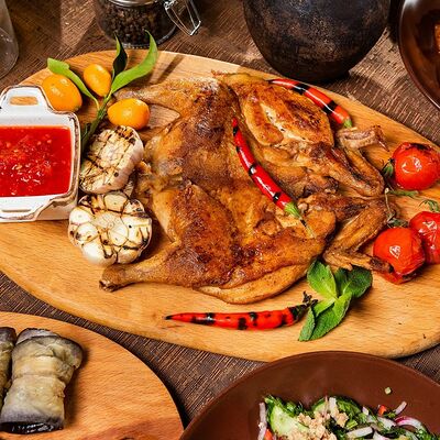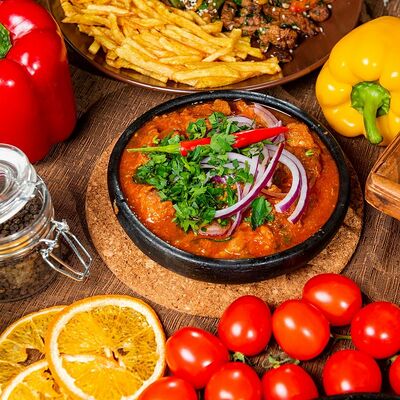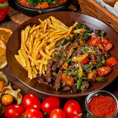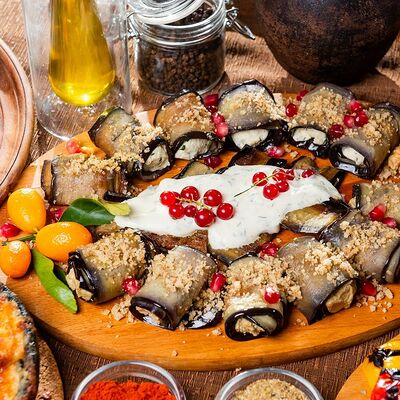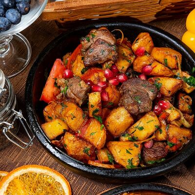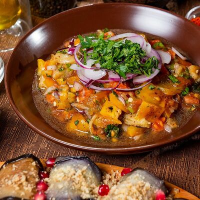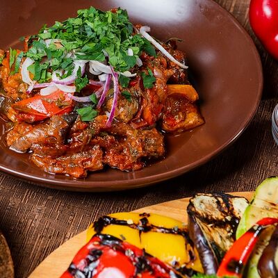 Баклажаны, помидоры, перец болгарский, картофель, чеснок, специи