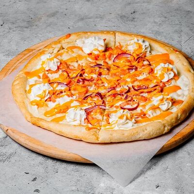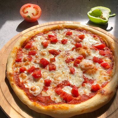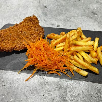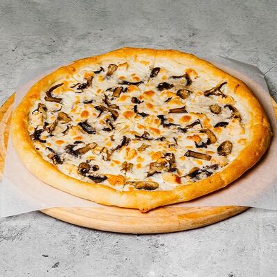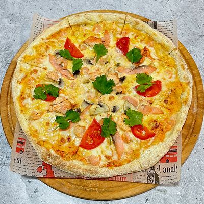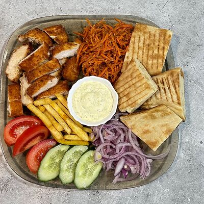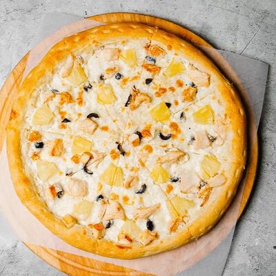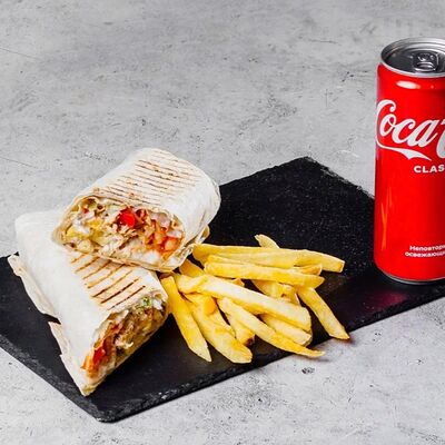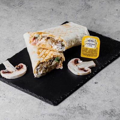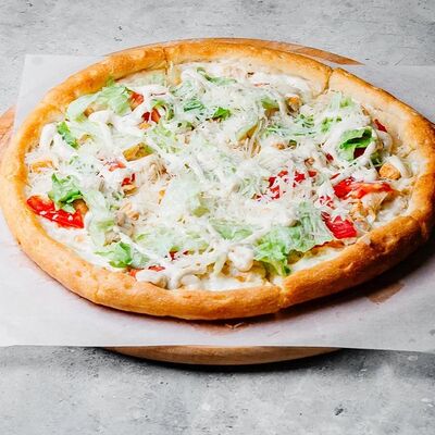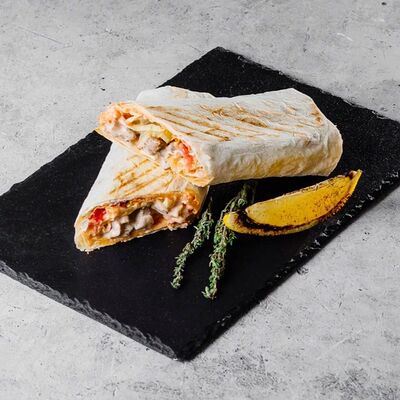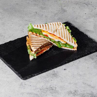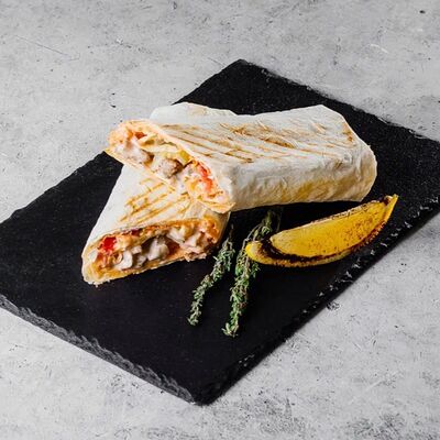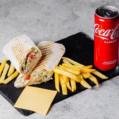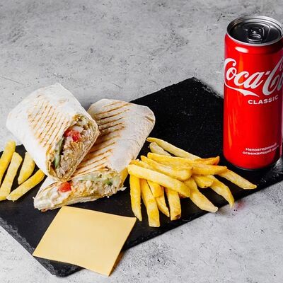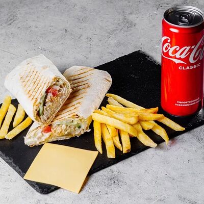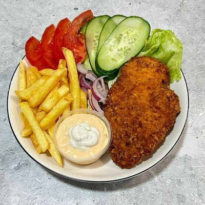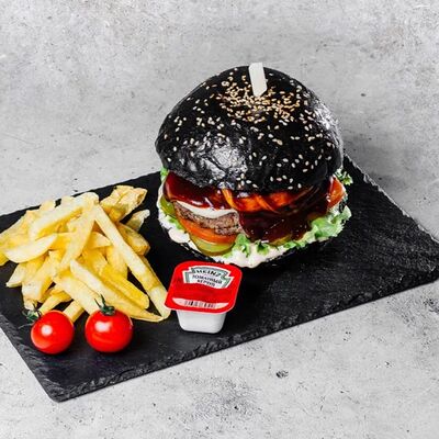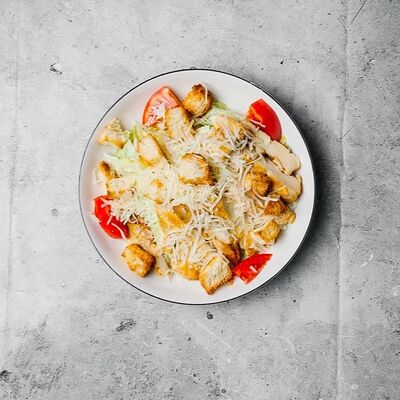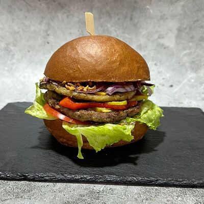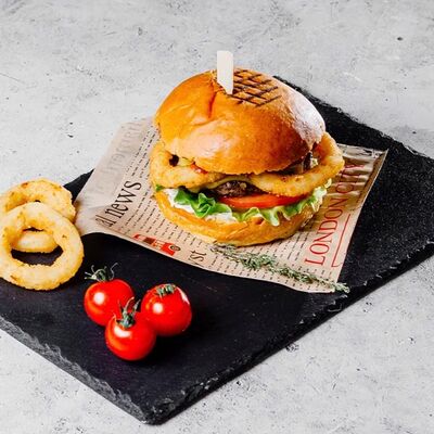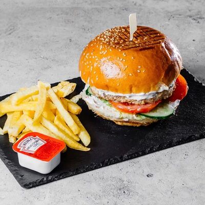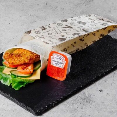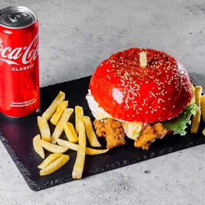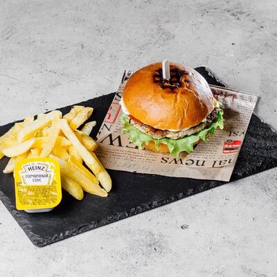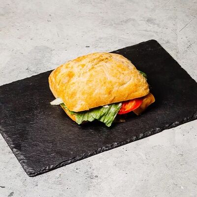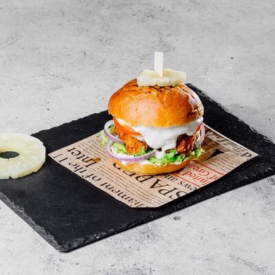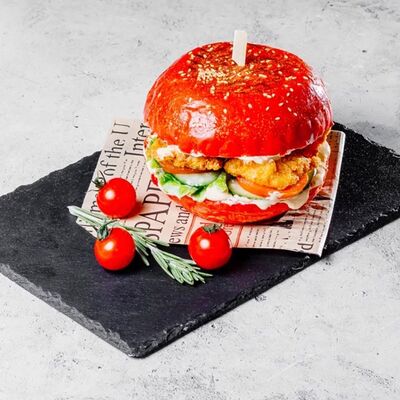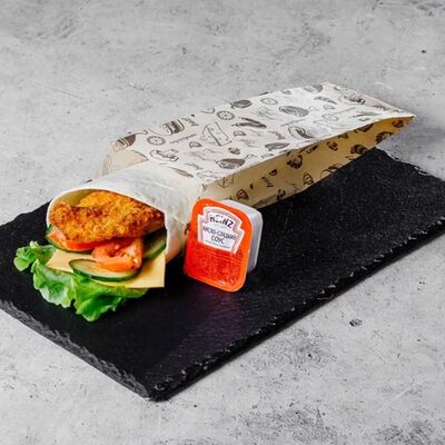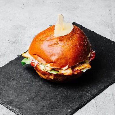 Хрустящая ароматная булочка, сочная котлета из курицы, соус, сливочный топленый сыр, свежий огурец, розовые томаты, лист салата