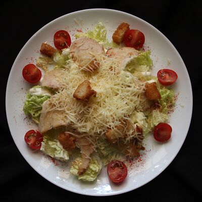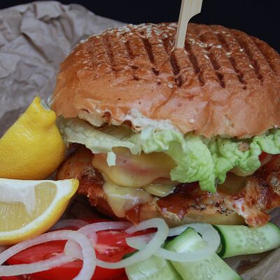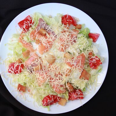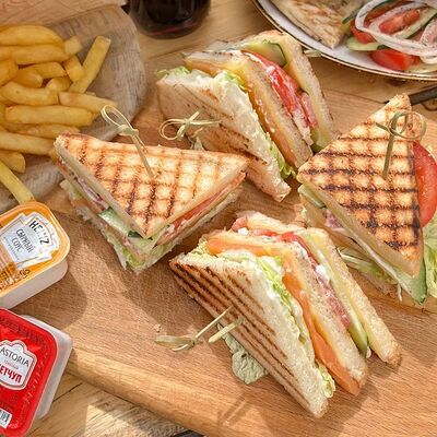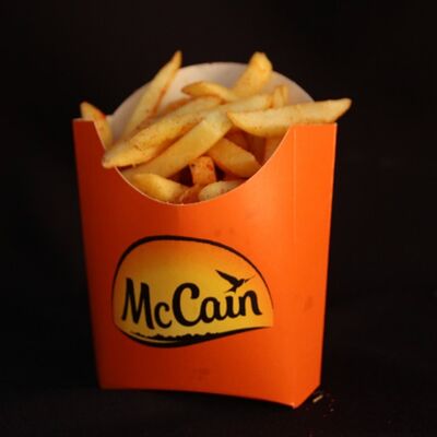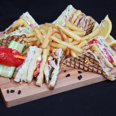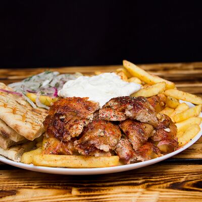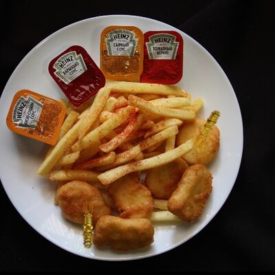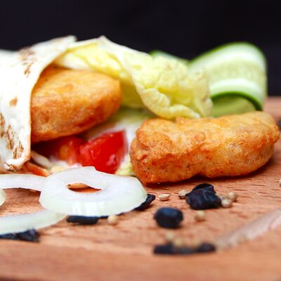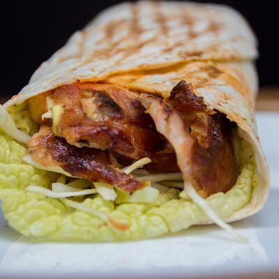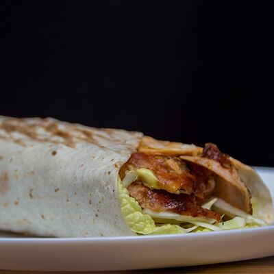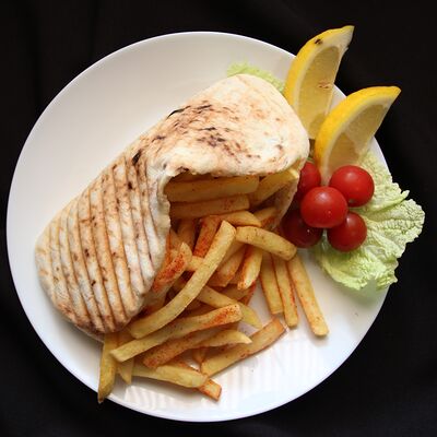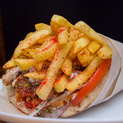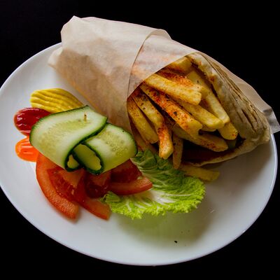Тортилья, фирменный соус, огурцы, помидоры, капуста, куриное филе, кетчуп, лук, картофель фри