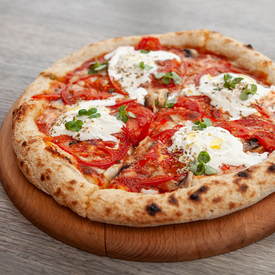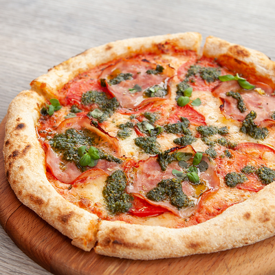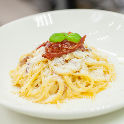 Паста Карбонара приготовлена по классическому римскому рецепту. Паста из твердых сортов пшеницы, сыр парма (12 месяцев выдержки собственного производства), бекон, желток яичный, чеснок, петрушка, кинза, укроп, соль, перец, масло оливковое