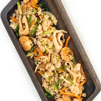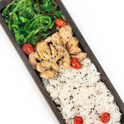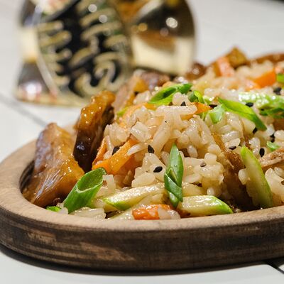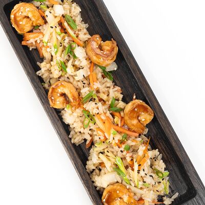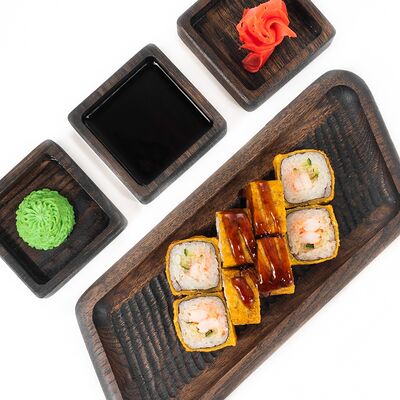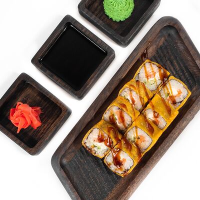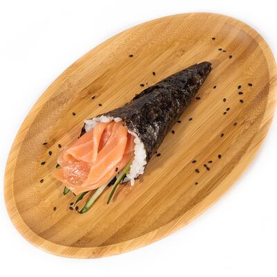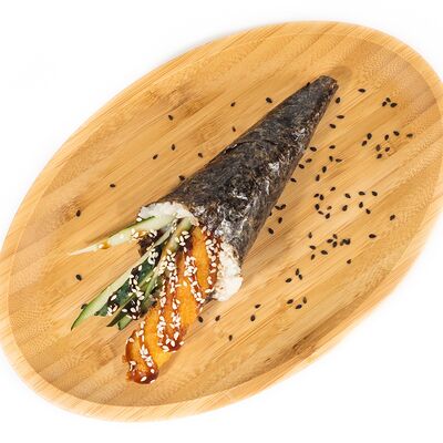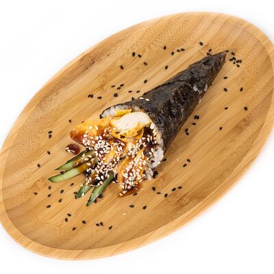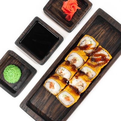 Рис, сыр сливочный, лосось, огурец свежий, соус унаги, тесто харумаки, майонезная шапочка (майонез, чеснок, кунжутное масло)