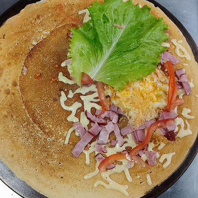 Шоколад, фрукт на выбор (банан, киви, клубника), тесто (молоко 2,5 %, мука высший сорт, яйцо куриное, сахар, соль, сода)