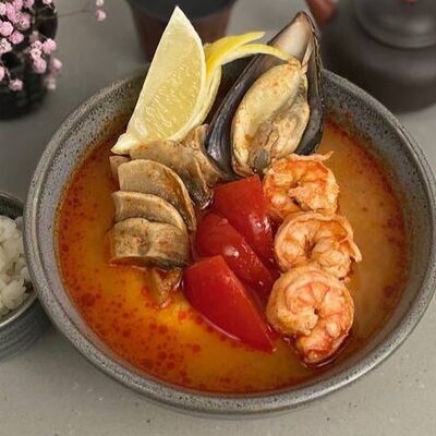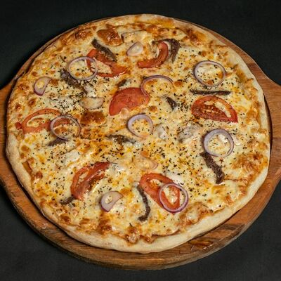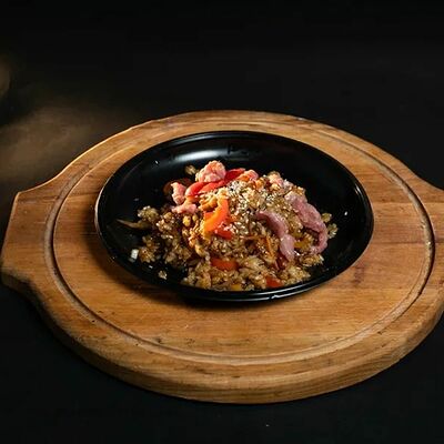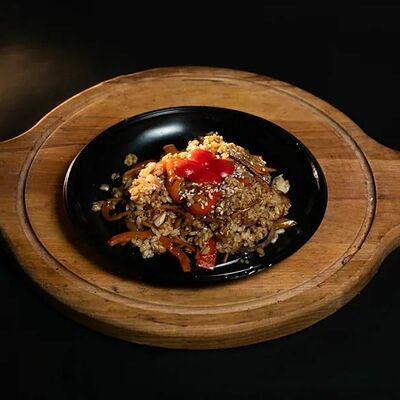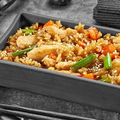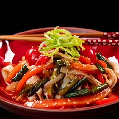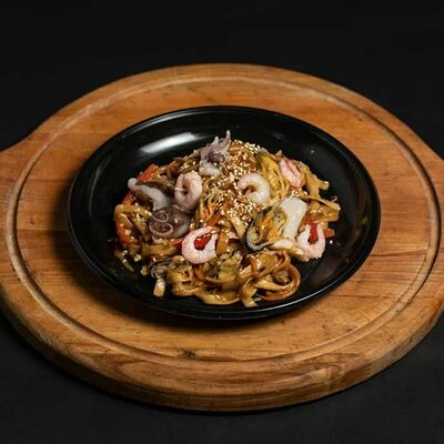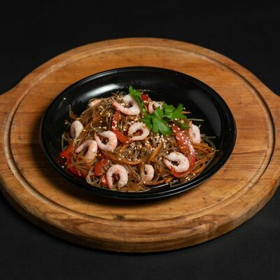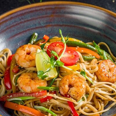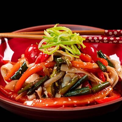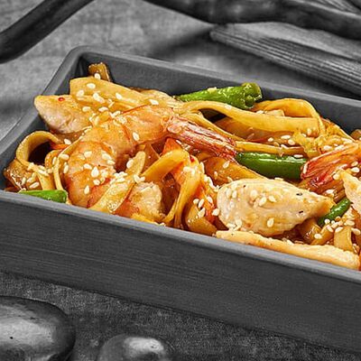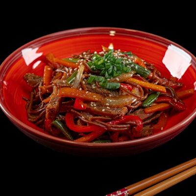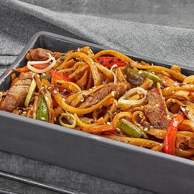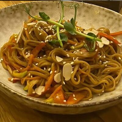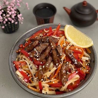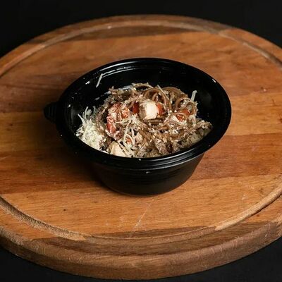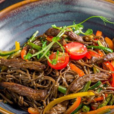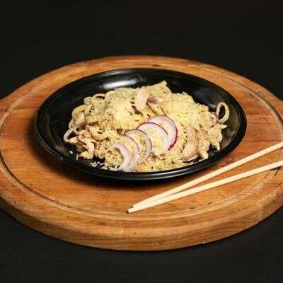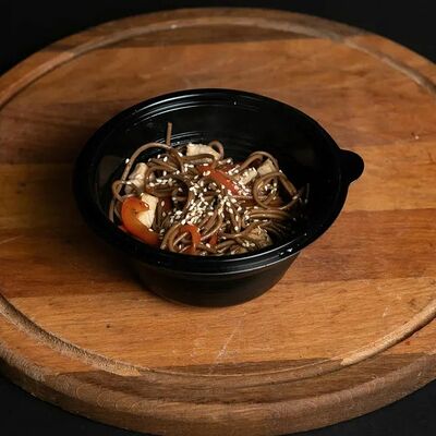 Гречневая лапша соба, куриное филе, соевый соус, соус терияки, лук, сыр пармезан