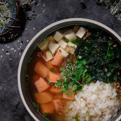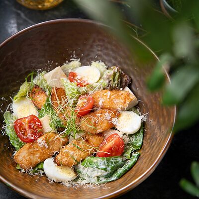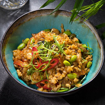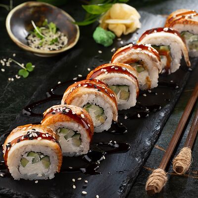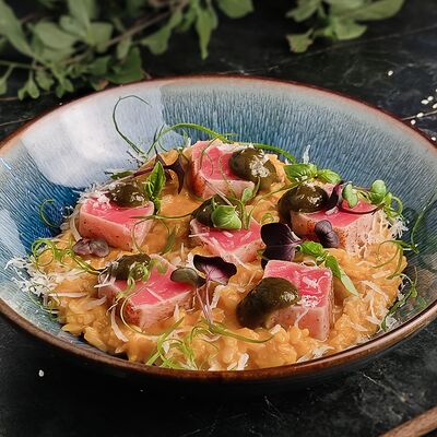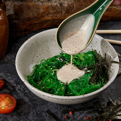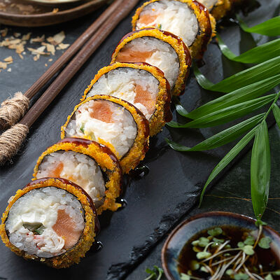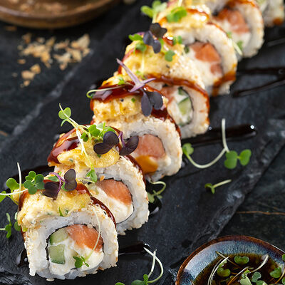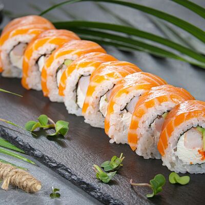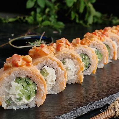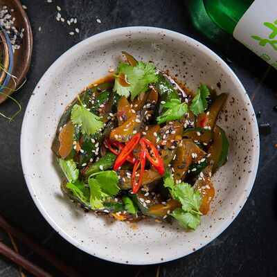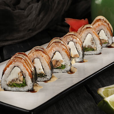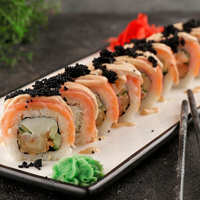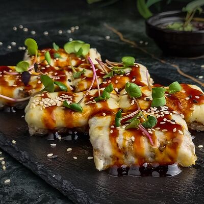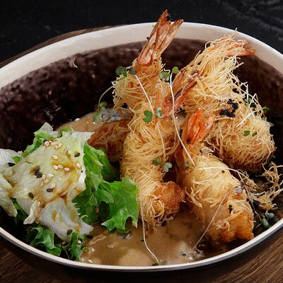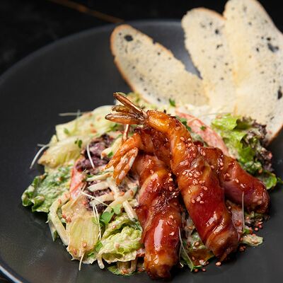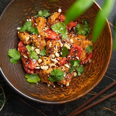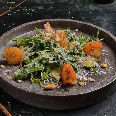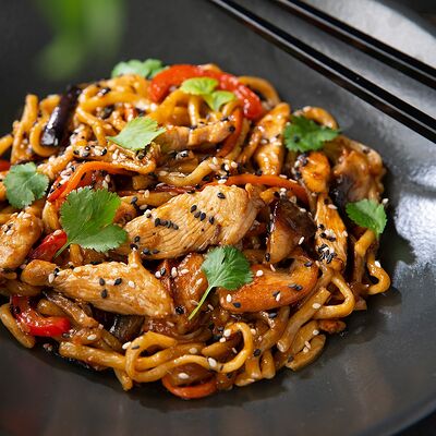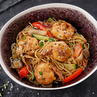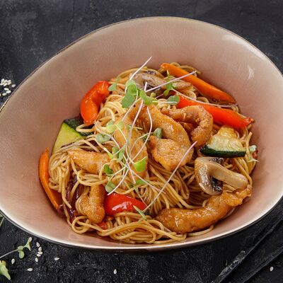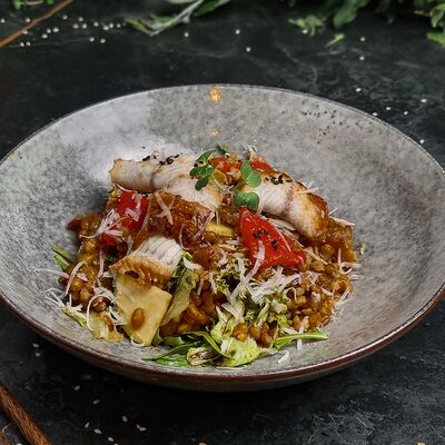 Обжаренное филе лосося, рисовая лапша, стручковая фасоль, цукини, кунжут, лук зеленый, фирменная заправка