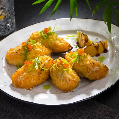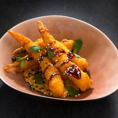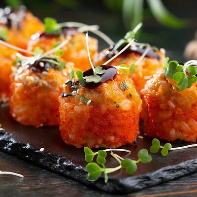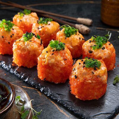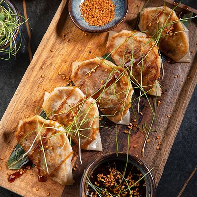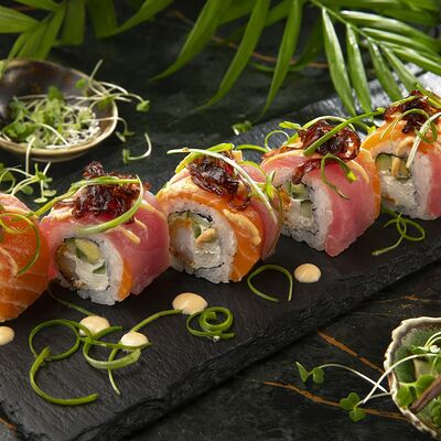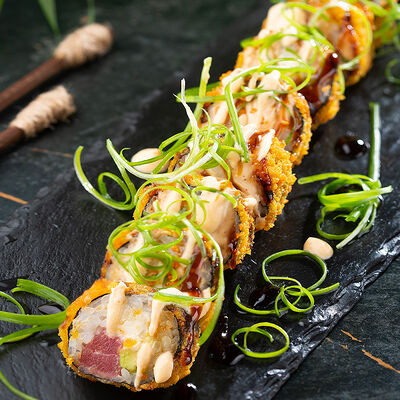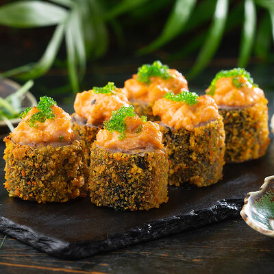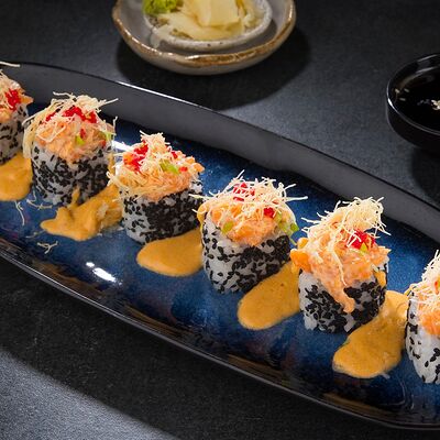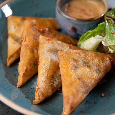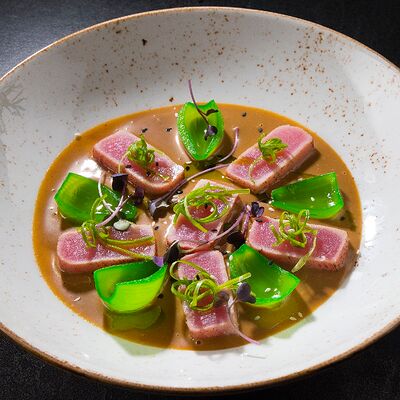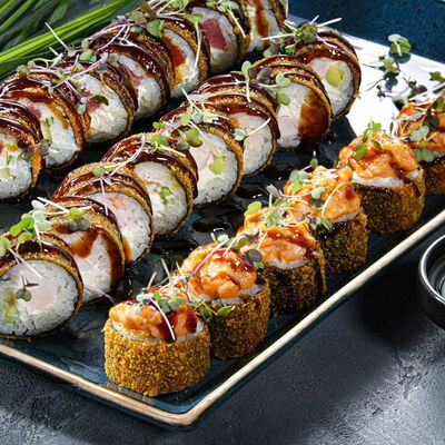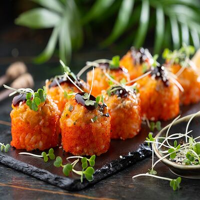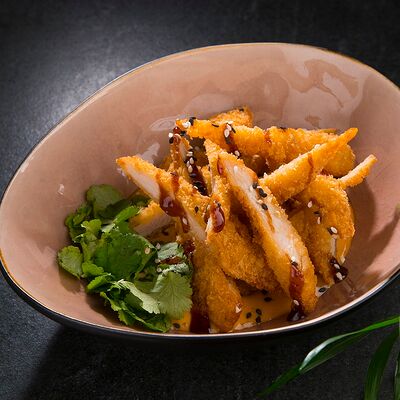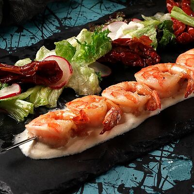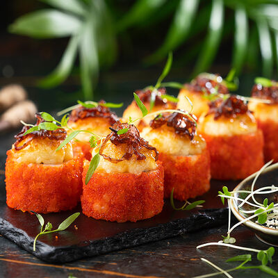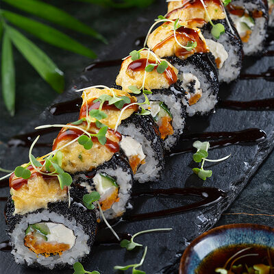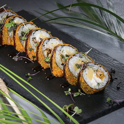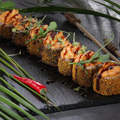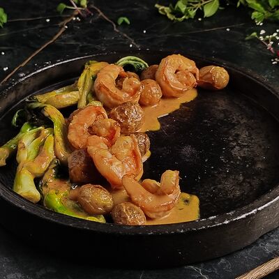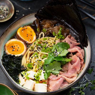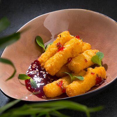 Обжаренное филе лосося, рисовая лапша, стручковая фасоль, цукини, кунжут, лук зеленый, фирменная заправка