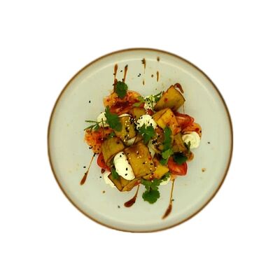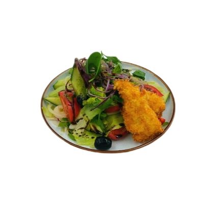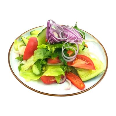 Помидоры, огурцы, перец сладкий, маслины, лук, сыр Фета (жареный), лист салата, оливковое масло, зелень, прованские травы