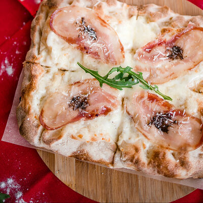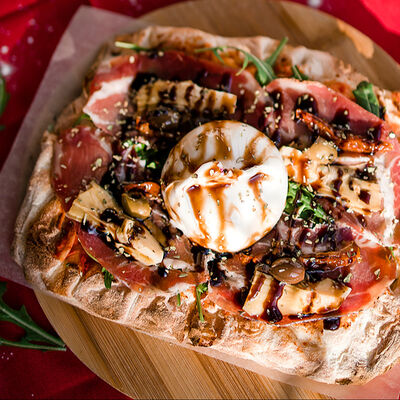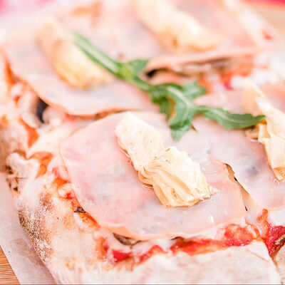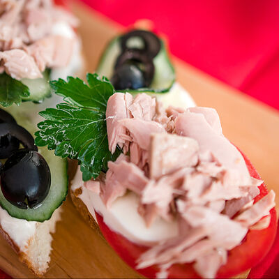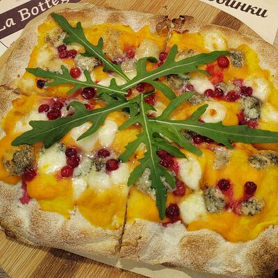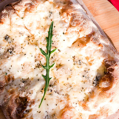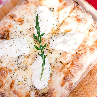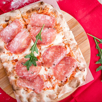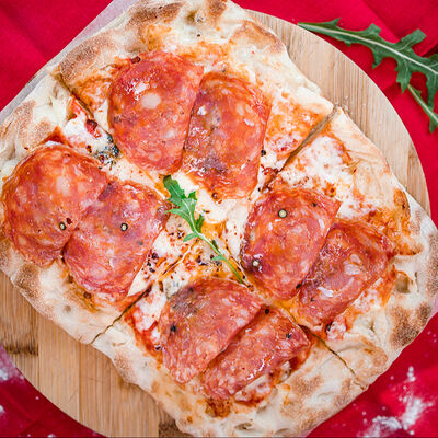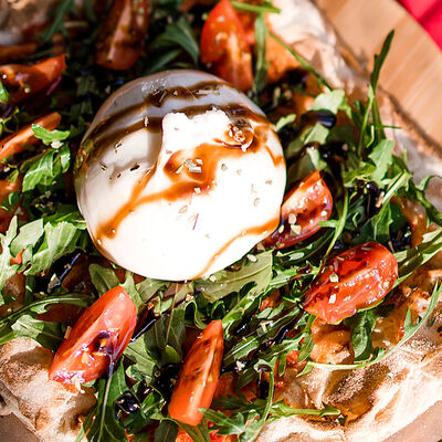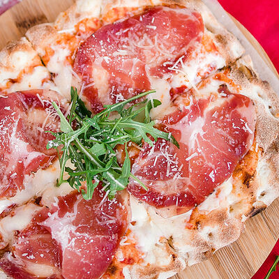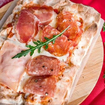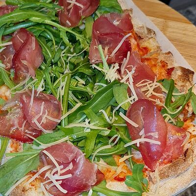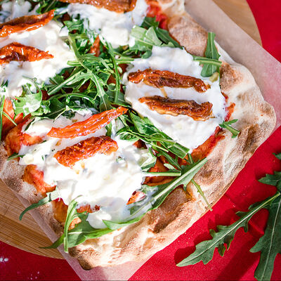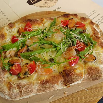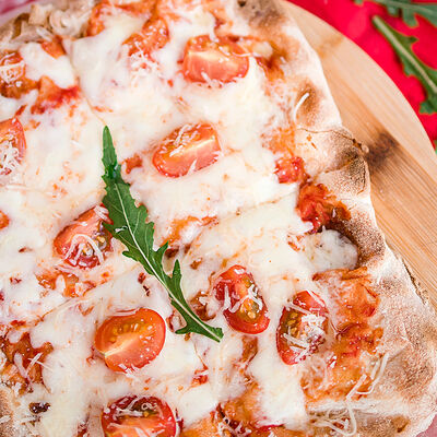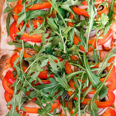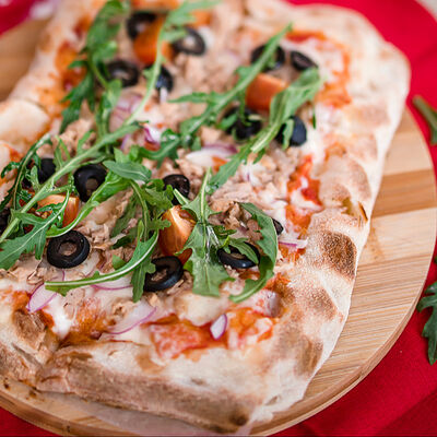 Томатный соус с базиликом, сыр Моцарелла, руккола, томаты черри, маслины чёрные, красный лук, филе тунца в собственном соку, оливковое масло