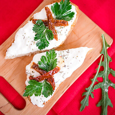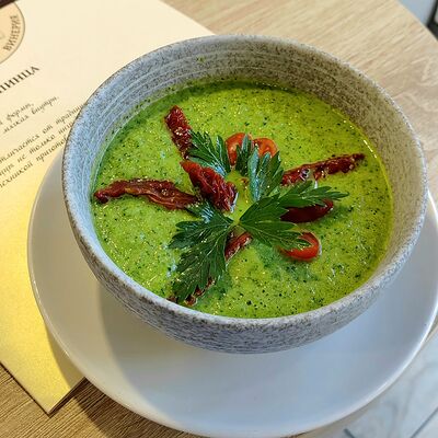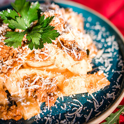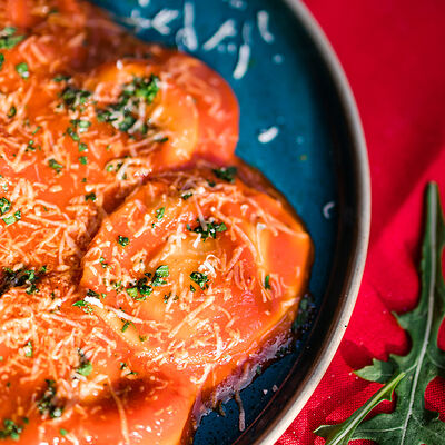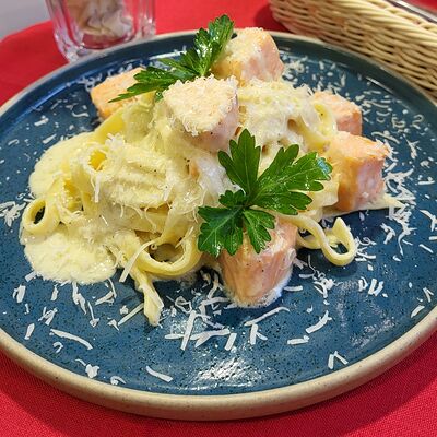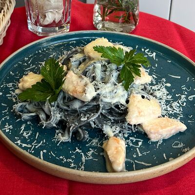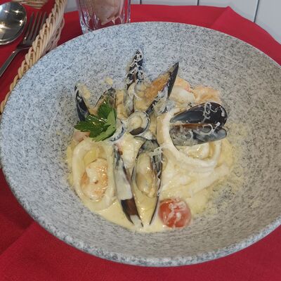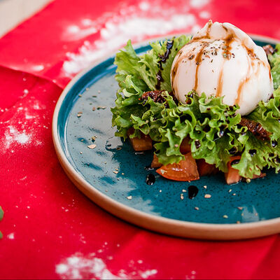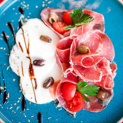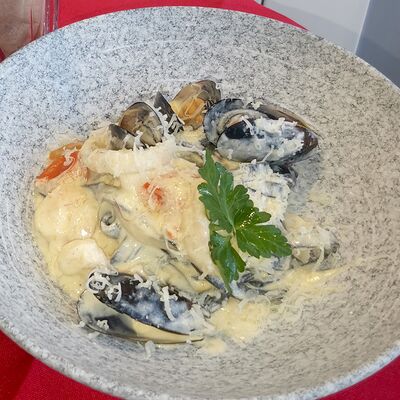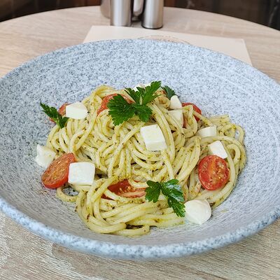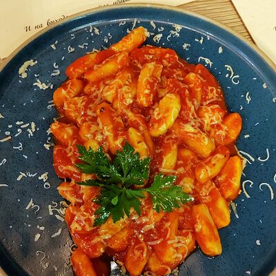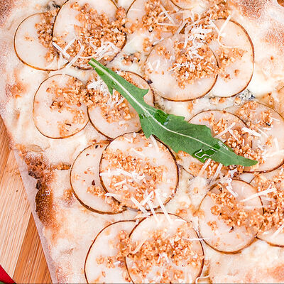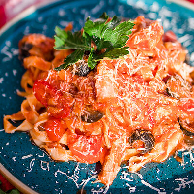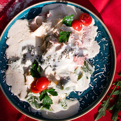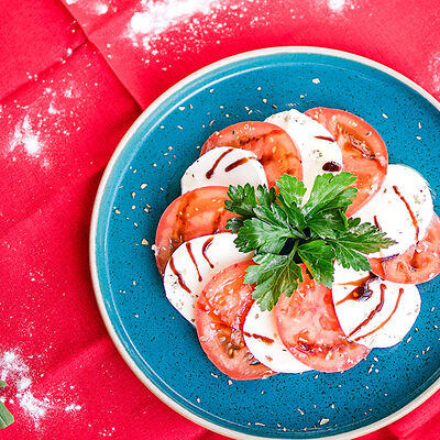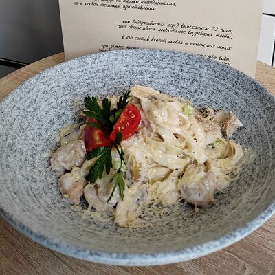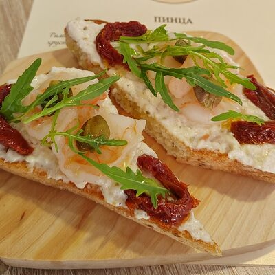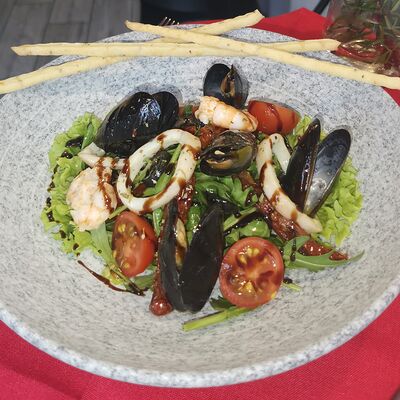 Томатный соус с базиликом, сыр Моцарелла, руккола, томаты черри, маслины чёрные, красный лук, филе тунца в собственном соку, оливковое масло