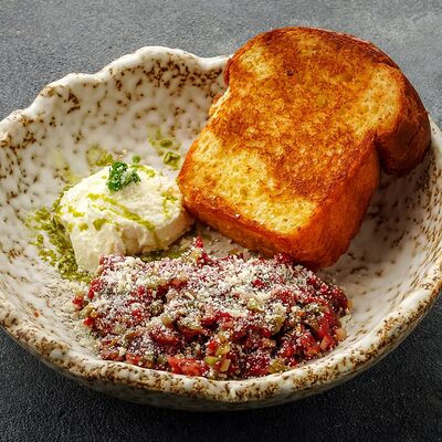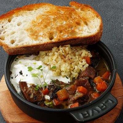 Рагу с говядиной, булгуром и страчателлой