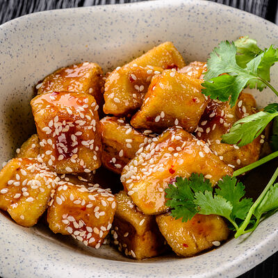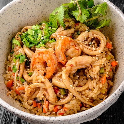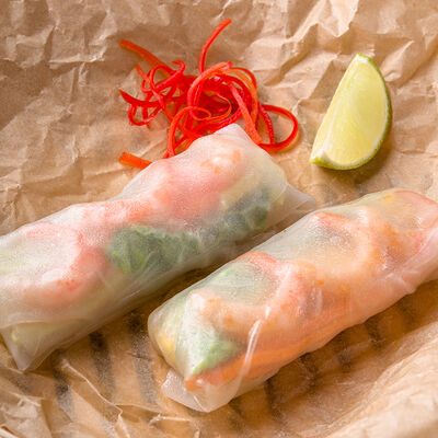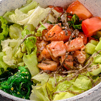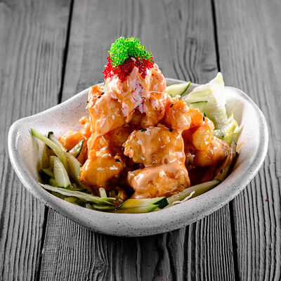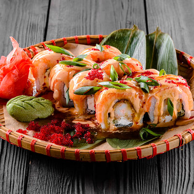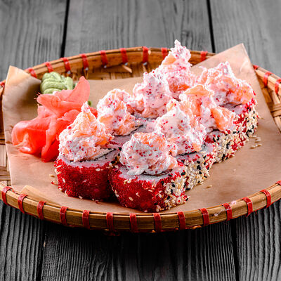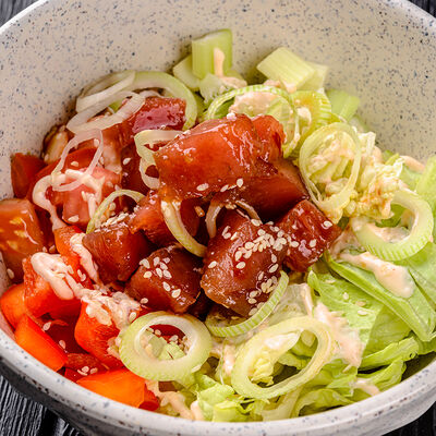 Рис, тунец, сельдерей, свежий помидор, болгарский перец, пекинская капуста, соус рыбный, соус сладкий чили, спайси соус, лук-порей, кунжут