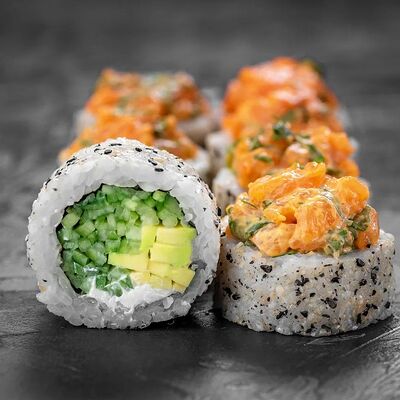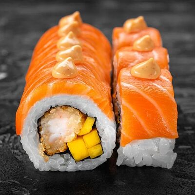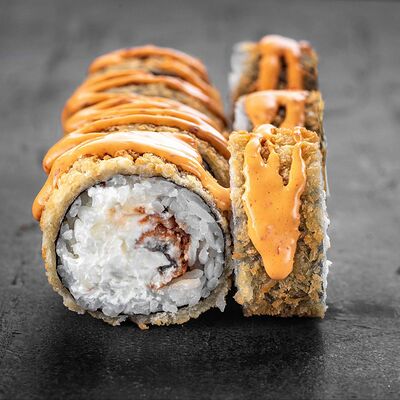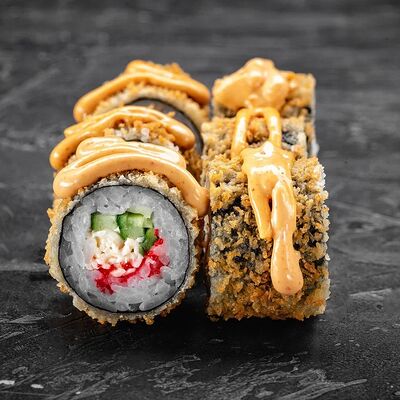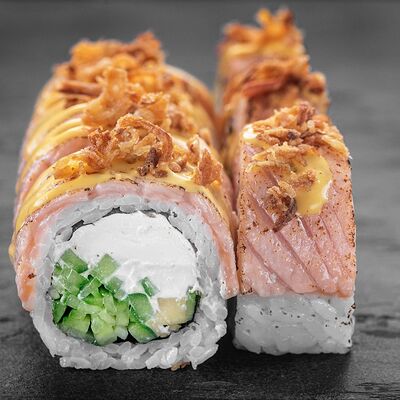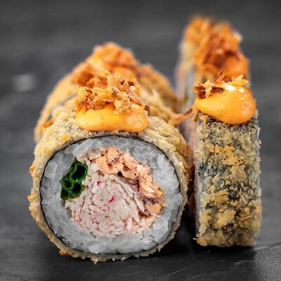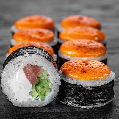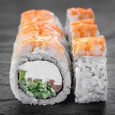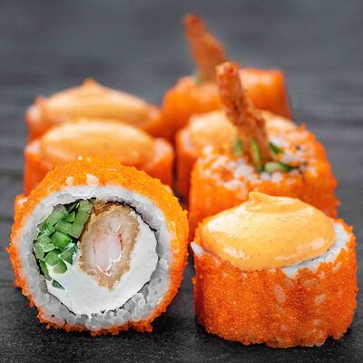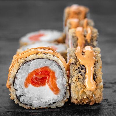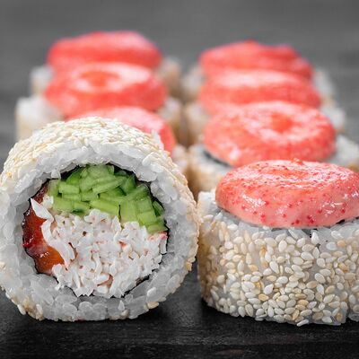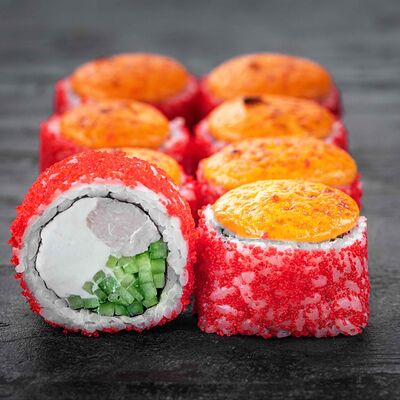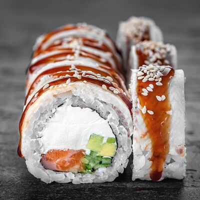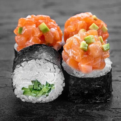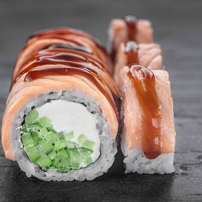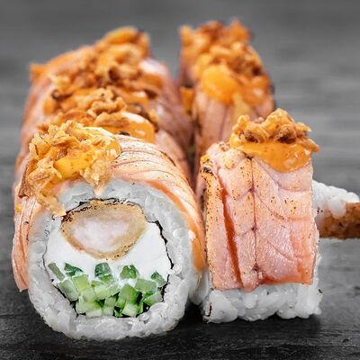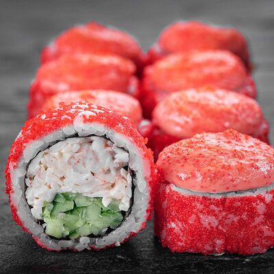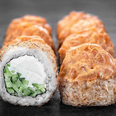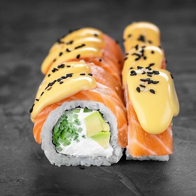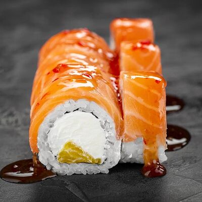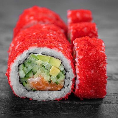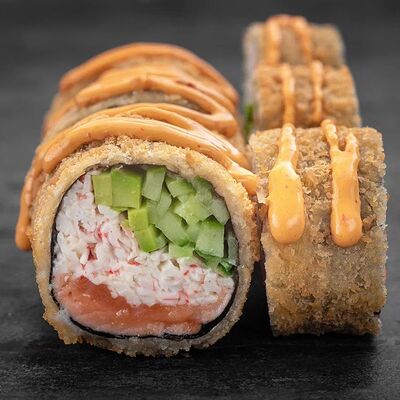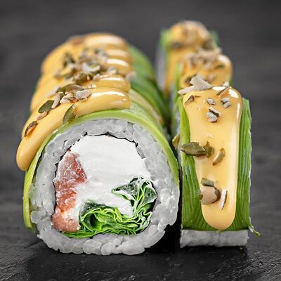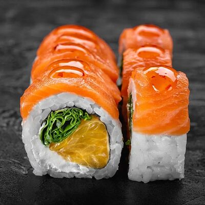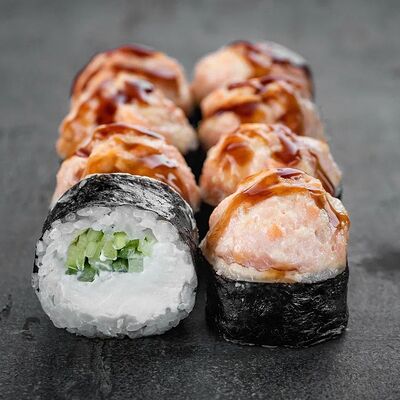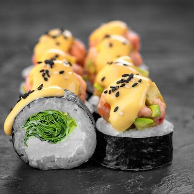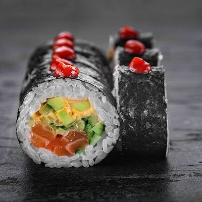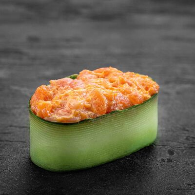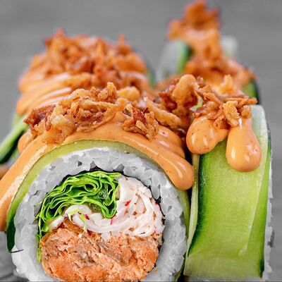 Нежный лосось в японском соусе спайси, хрустящий огурчик, авокадо и соус шрирача