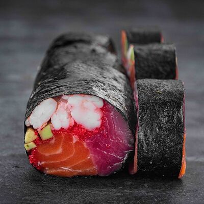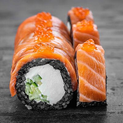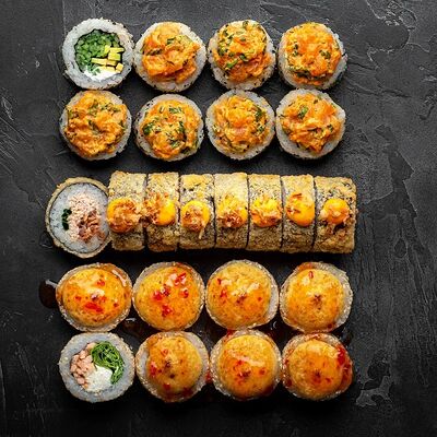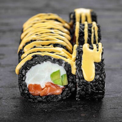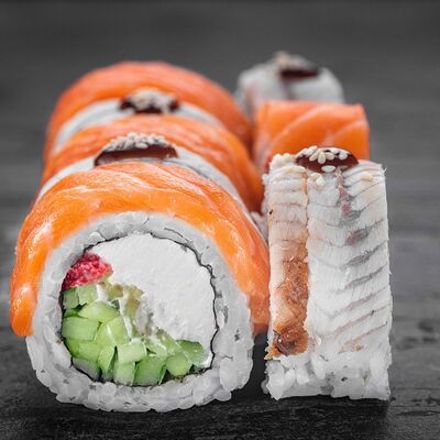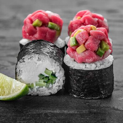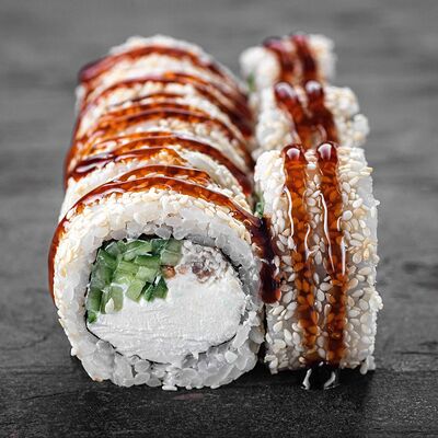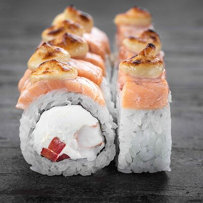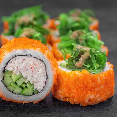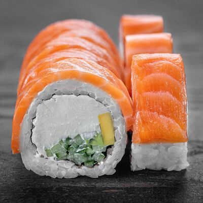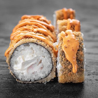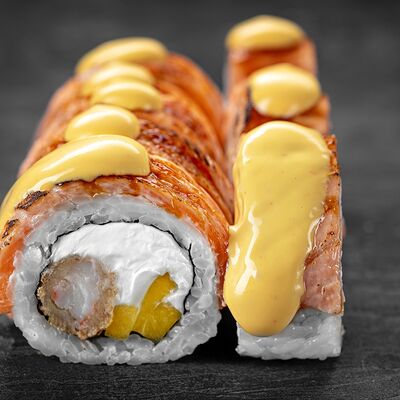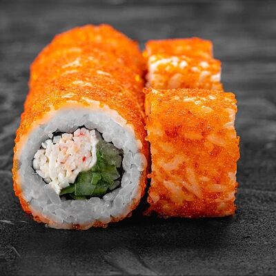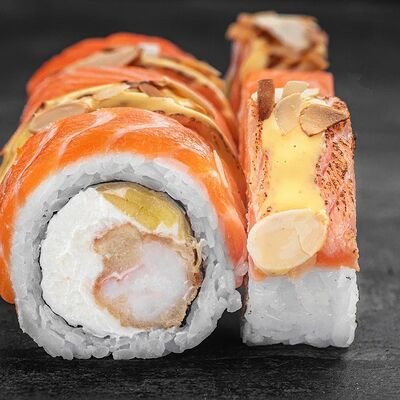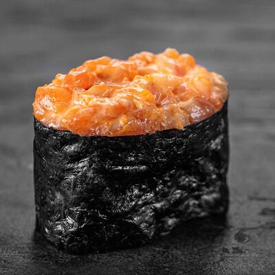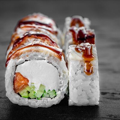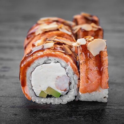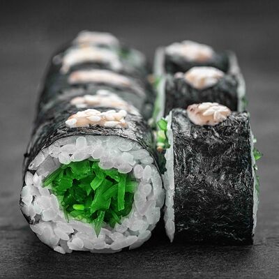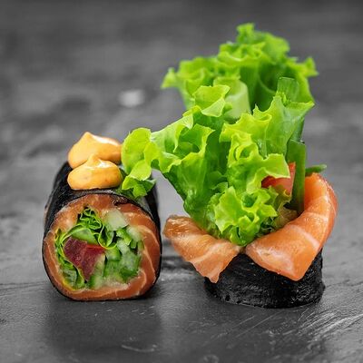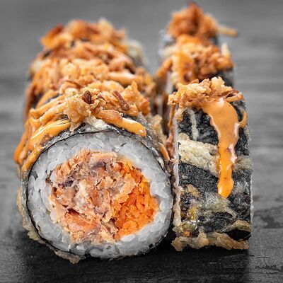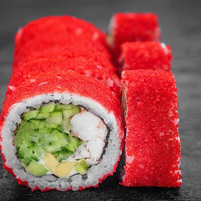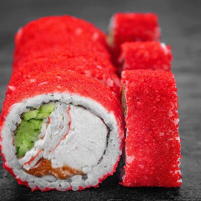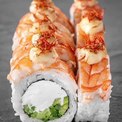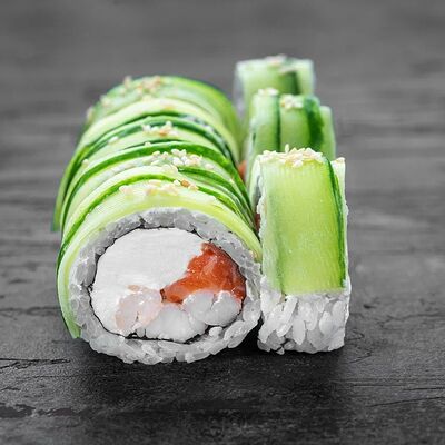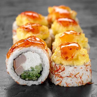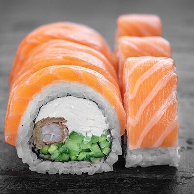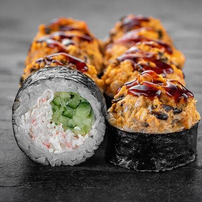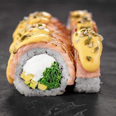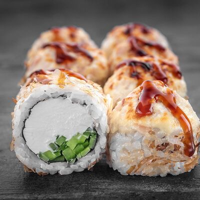 Нежный лосось в японском соусе спайси, хрустящий огурчик, авокадо и соус шрирача