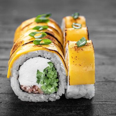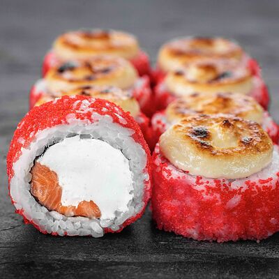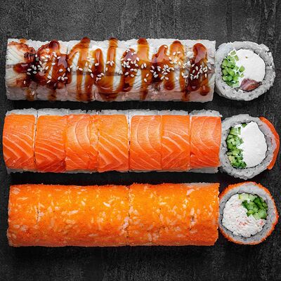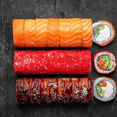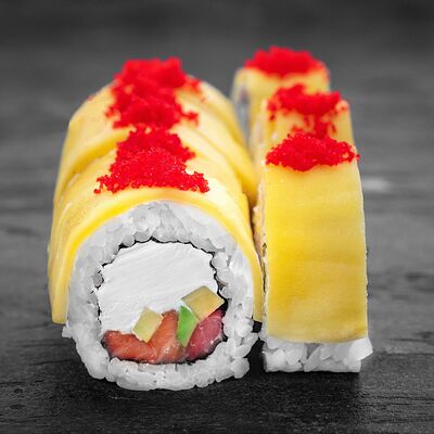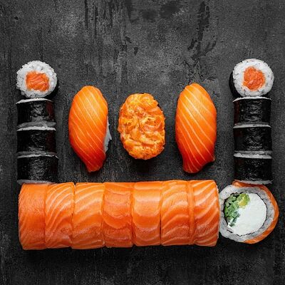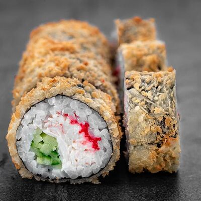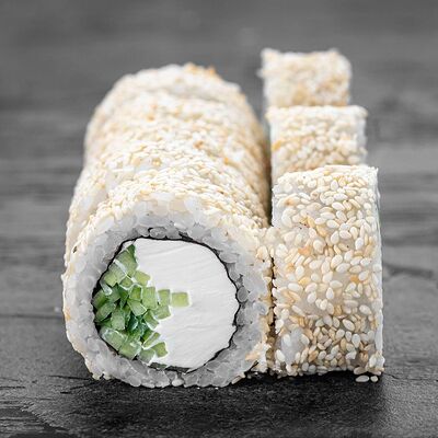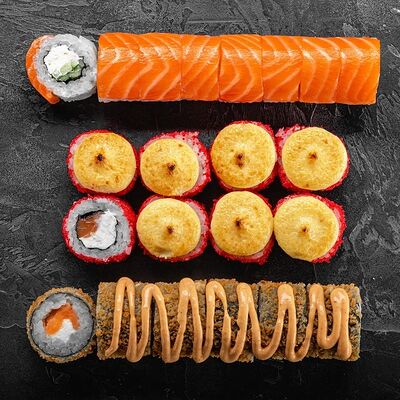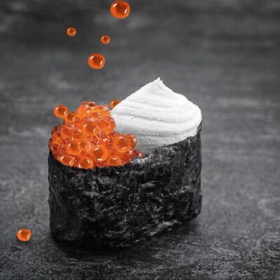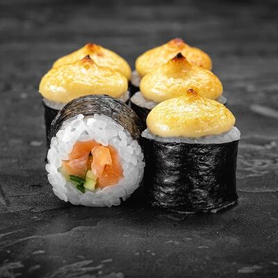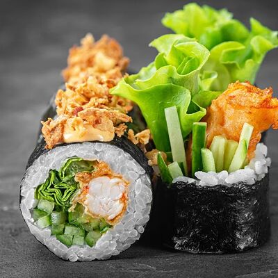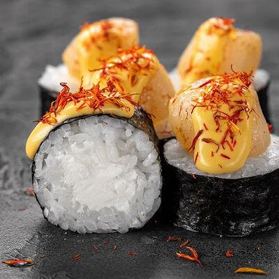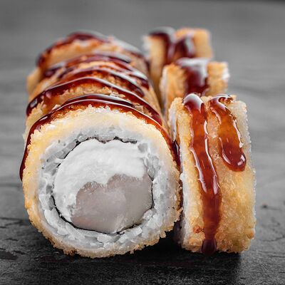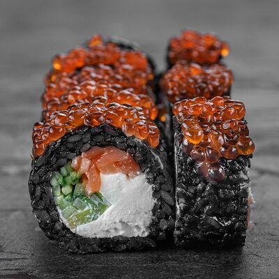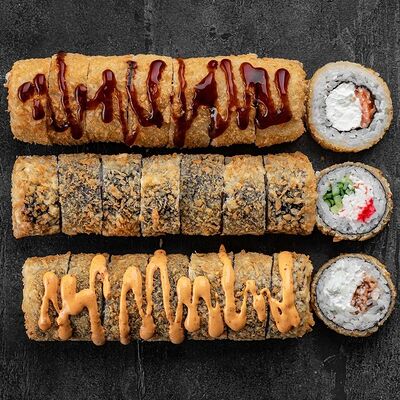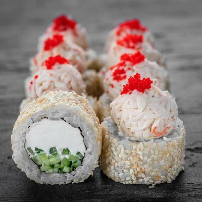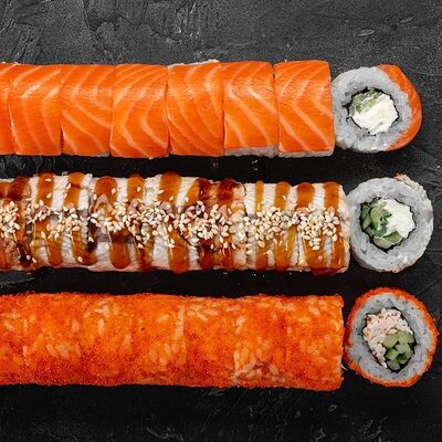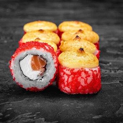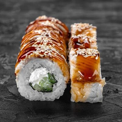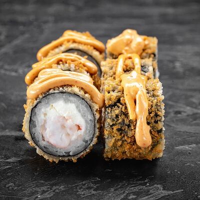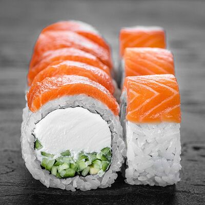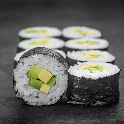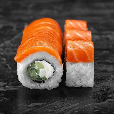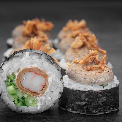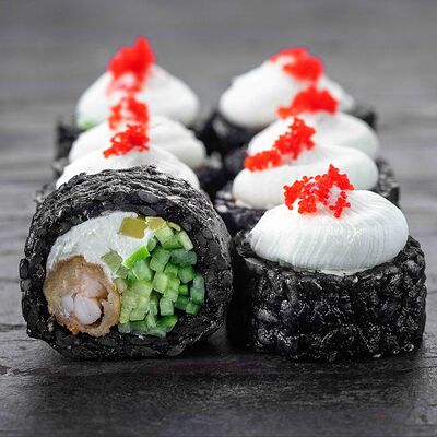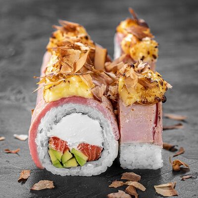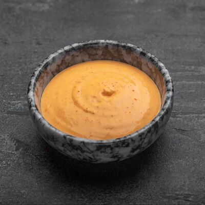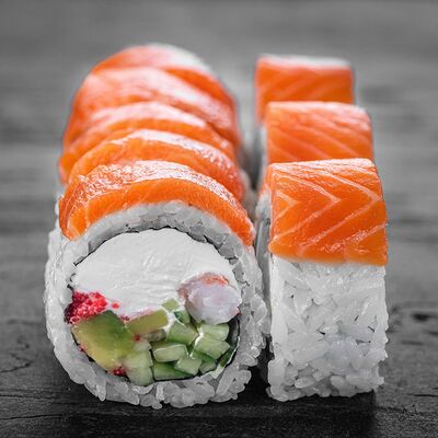 Нежный лосось в японском соусе спайси, хрустящий огурчик, авокадо и соус шрирача