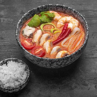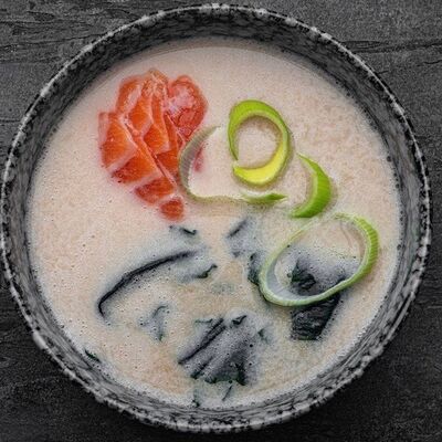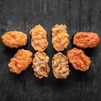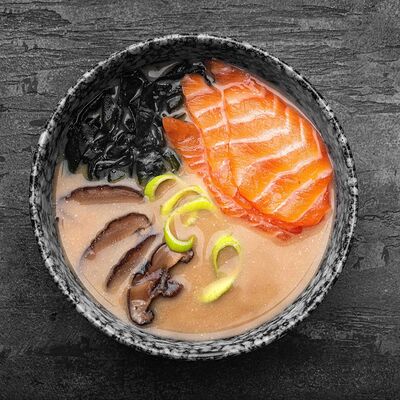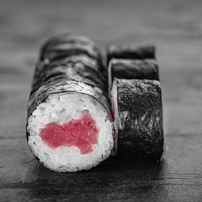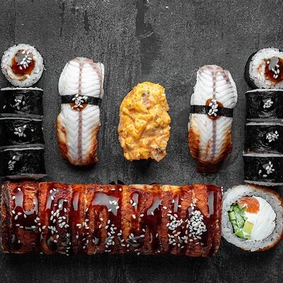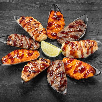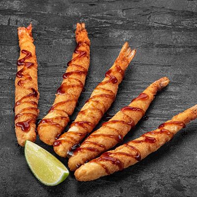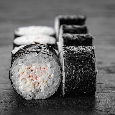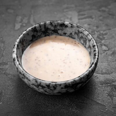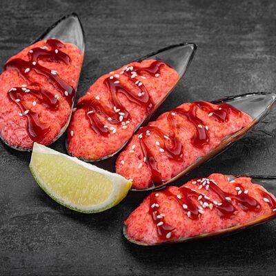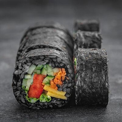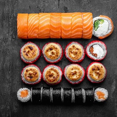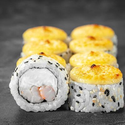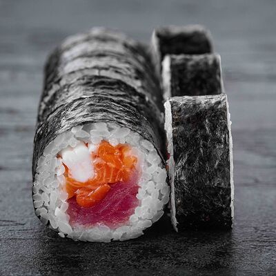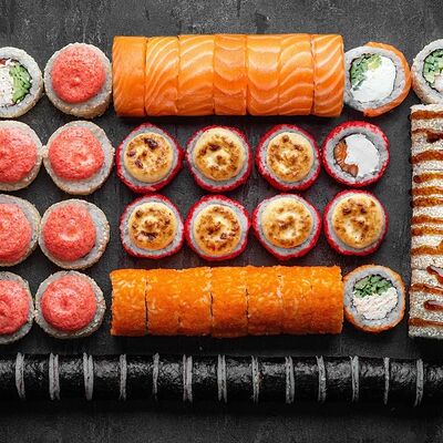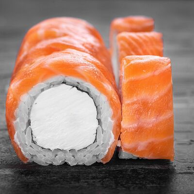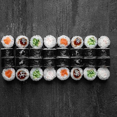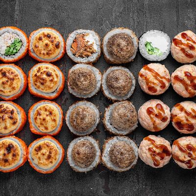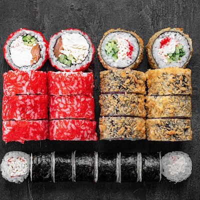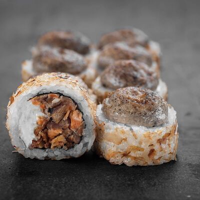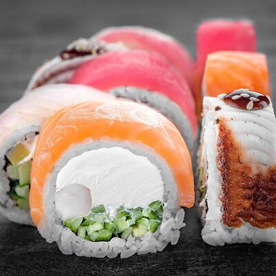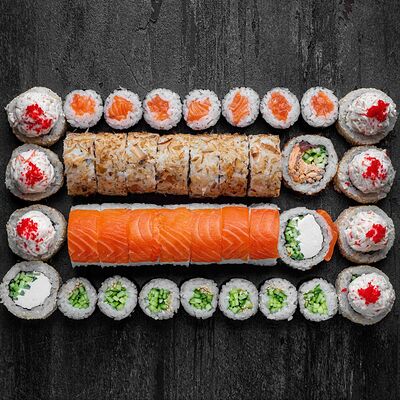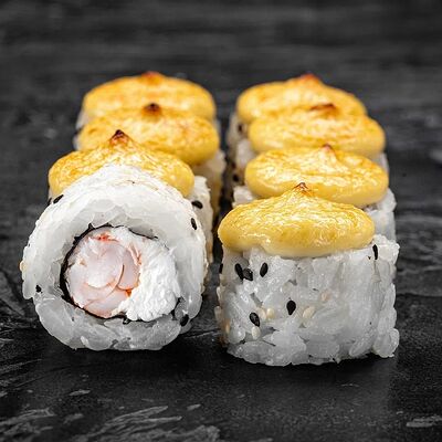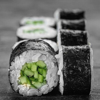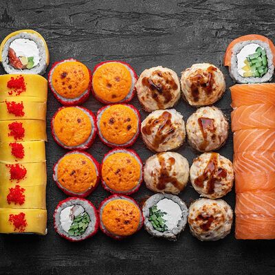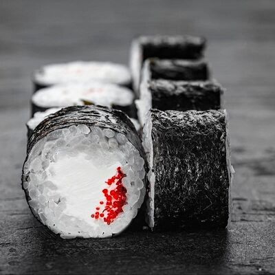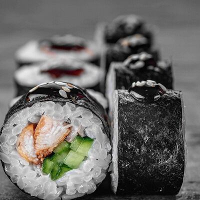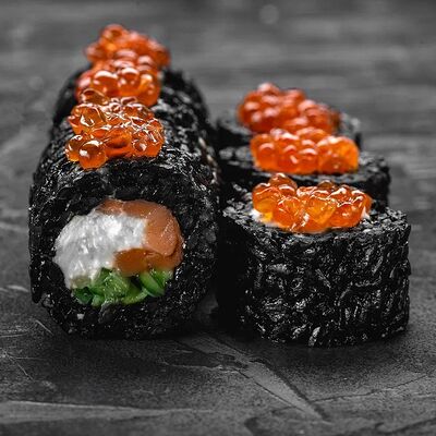 Нежный лосось в японском соусе спайси, хрустящий огурчик, авокадо и соус шрирача