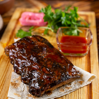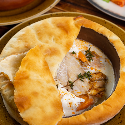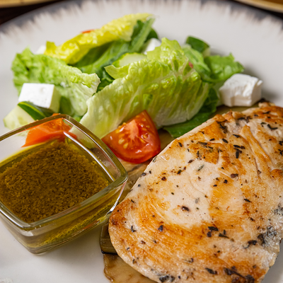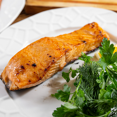 Филе горбуши в соусе катами. Подается с лавашом и зеленью