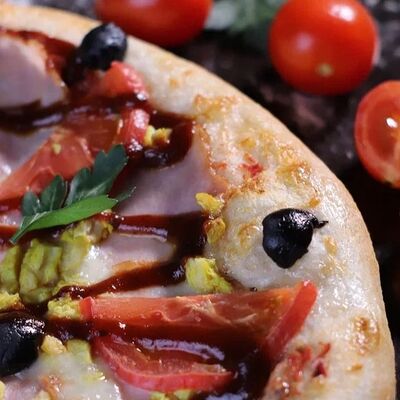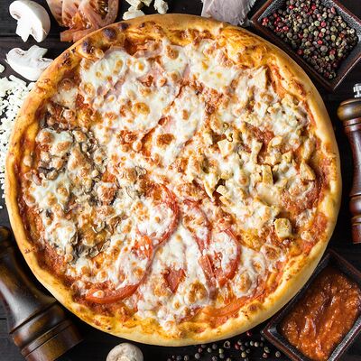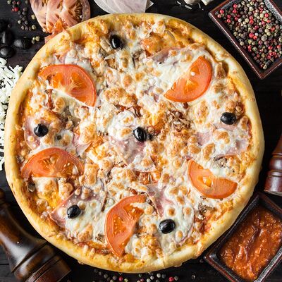 Соус помидорный, моцарелла, ветчина, шампиньоны свежие, помидоры свежие, маслины (30 см)