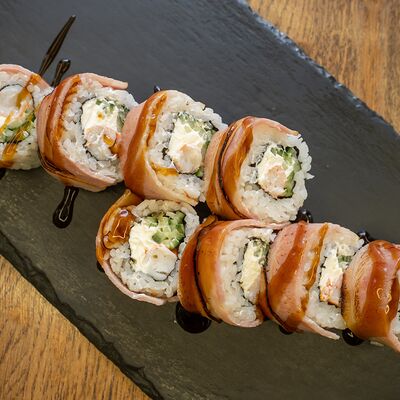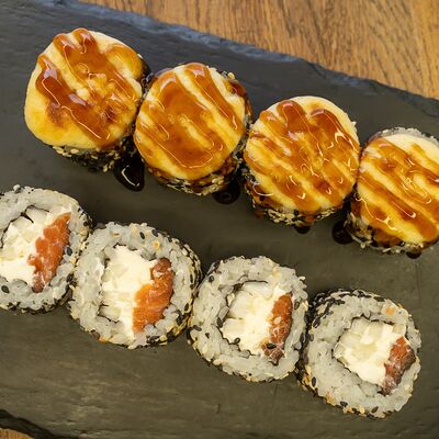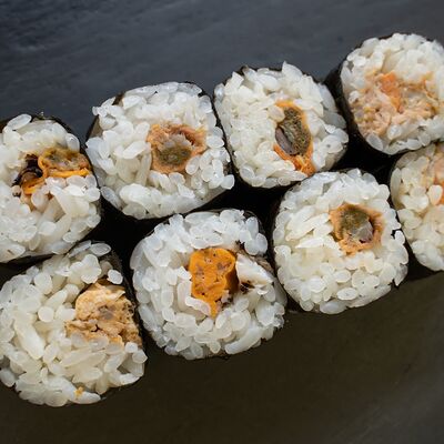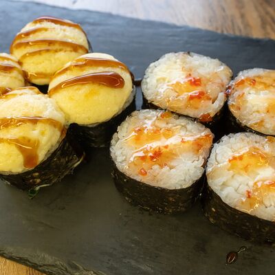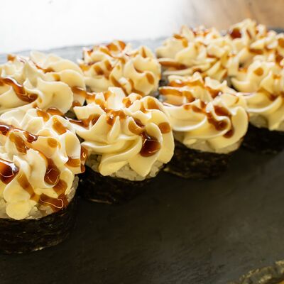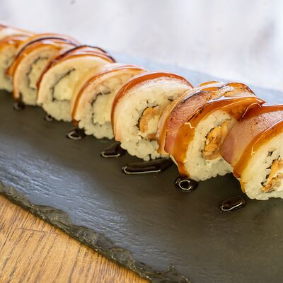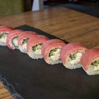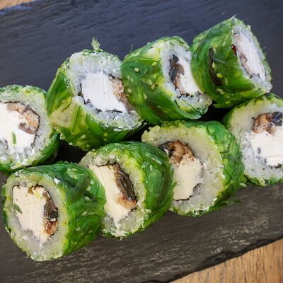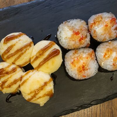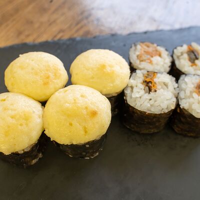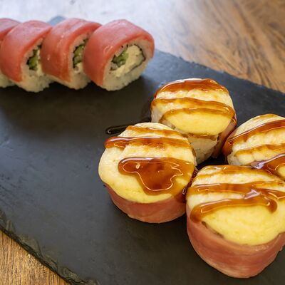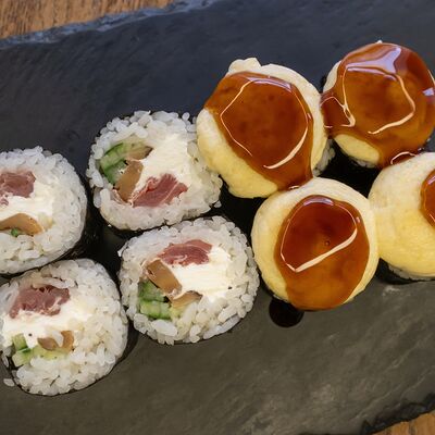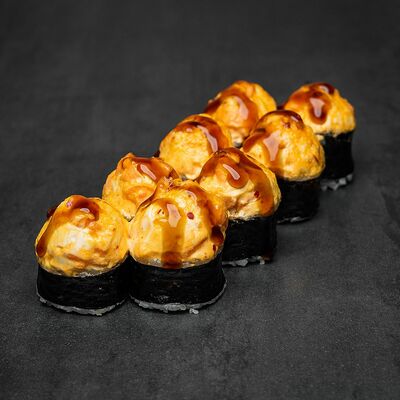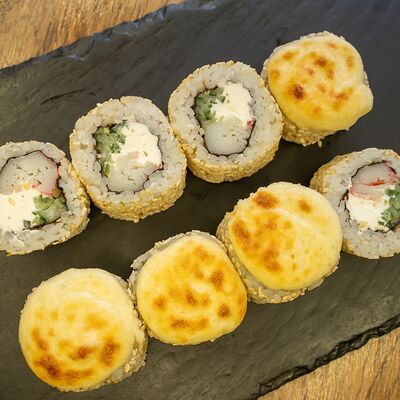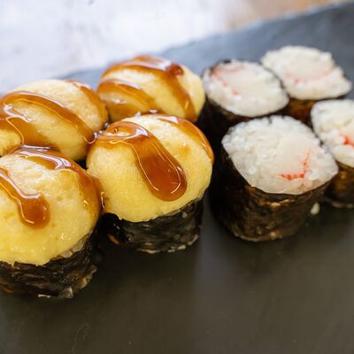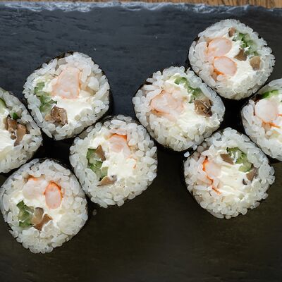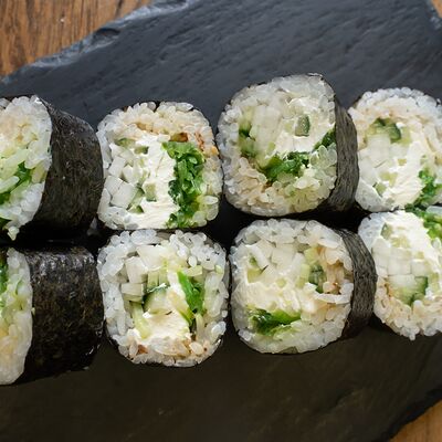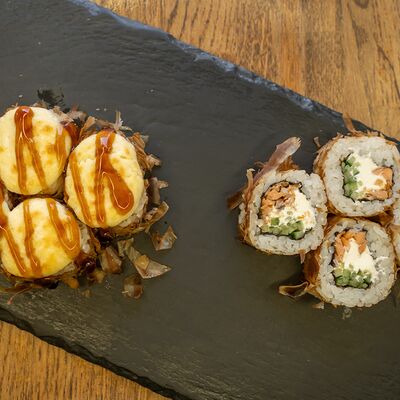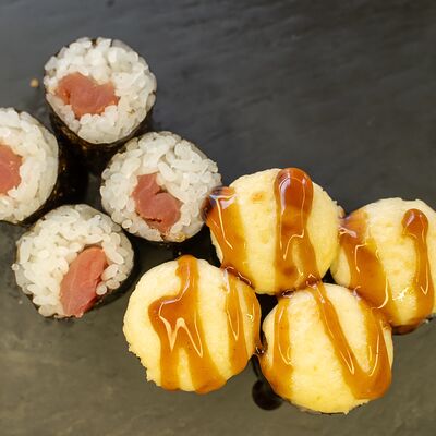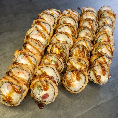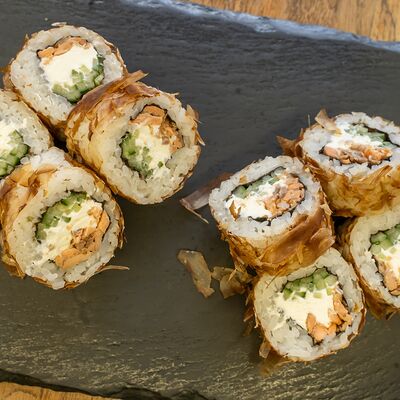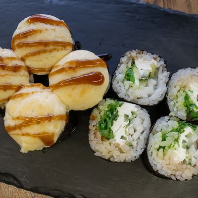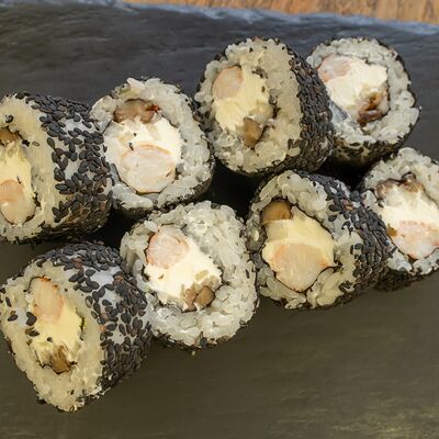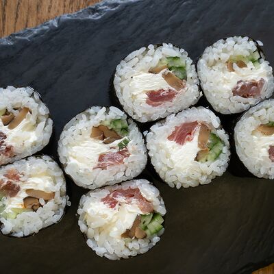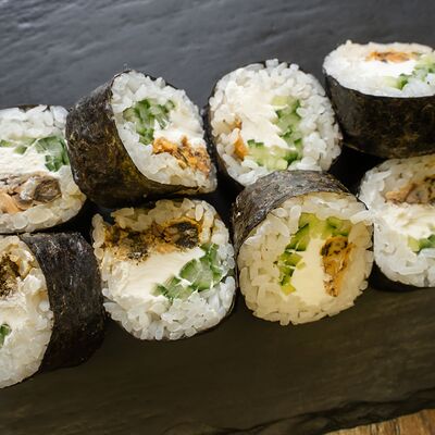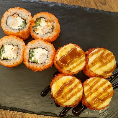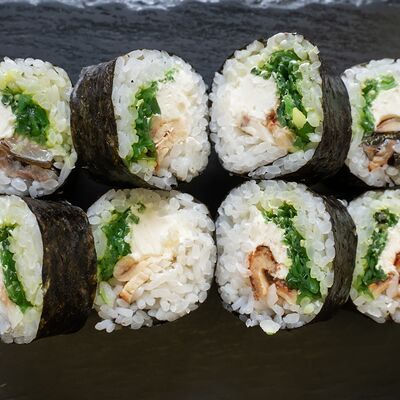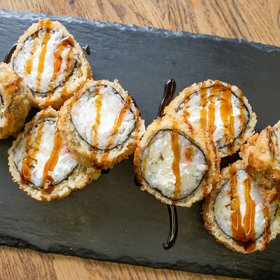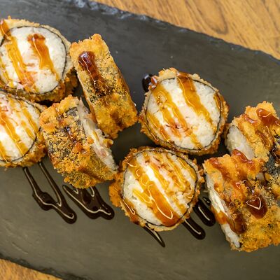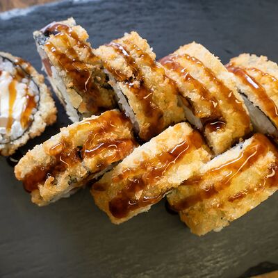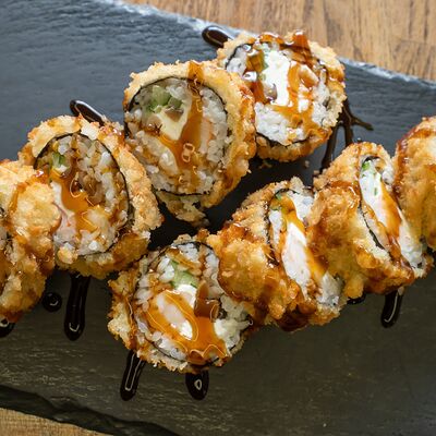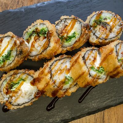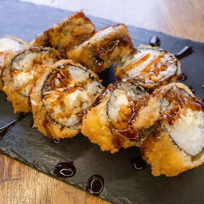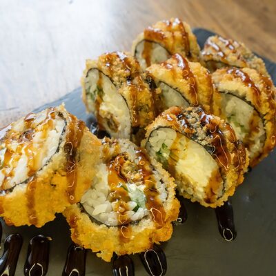 Рис, тунец, водоросли нори, сыр творожный, пекинская капуста, шиитаке, смесь темпура, панировочные сухари, соус терияки