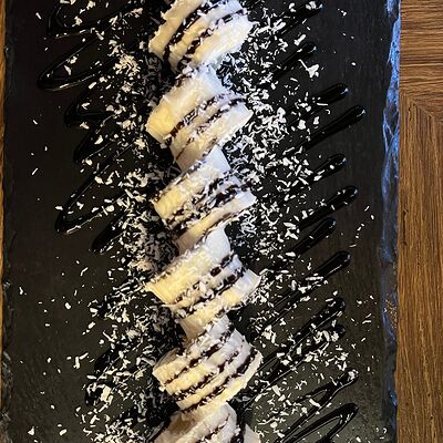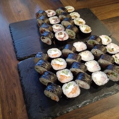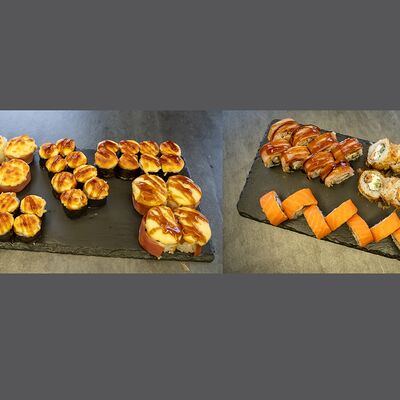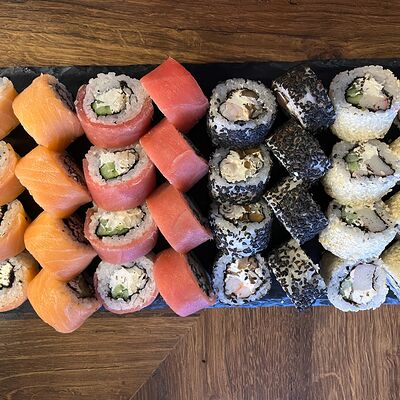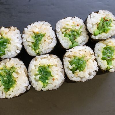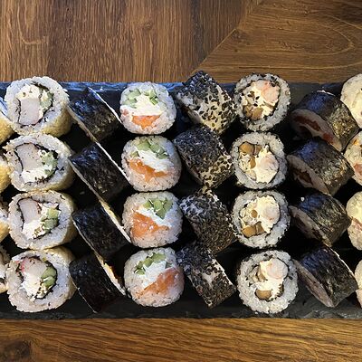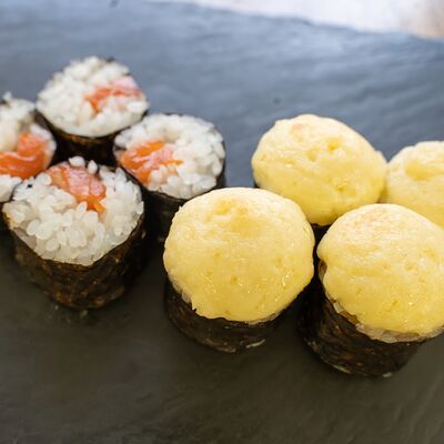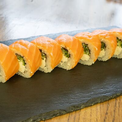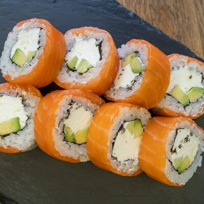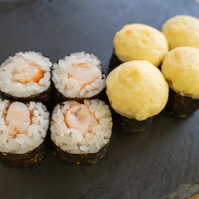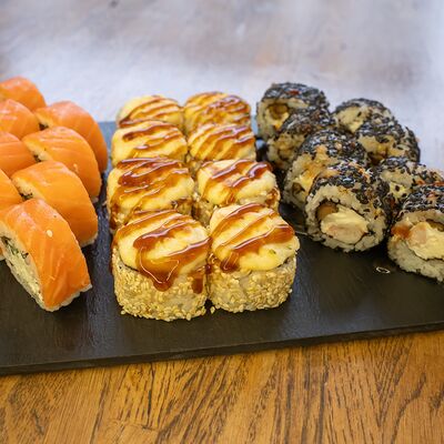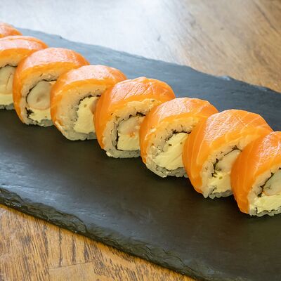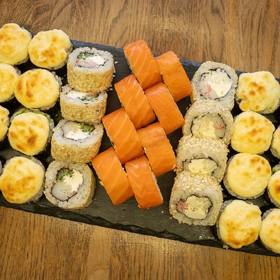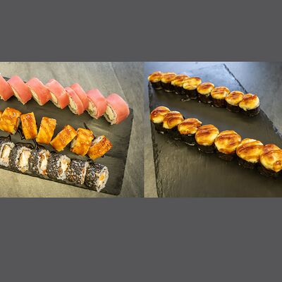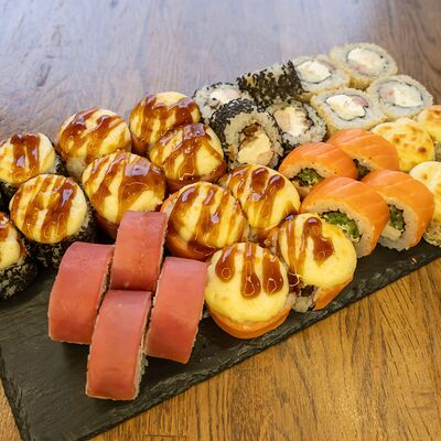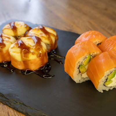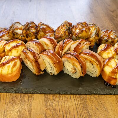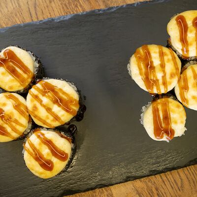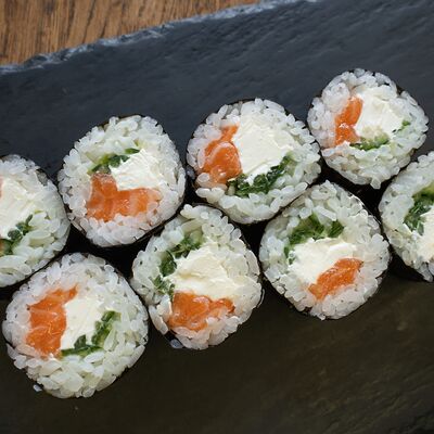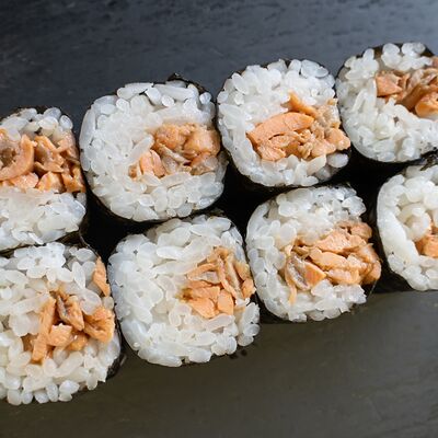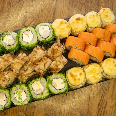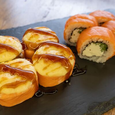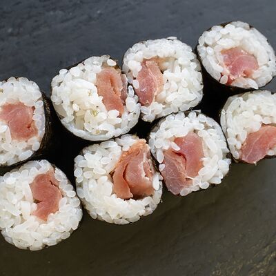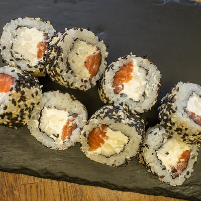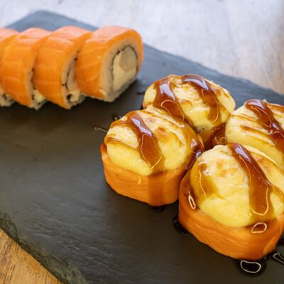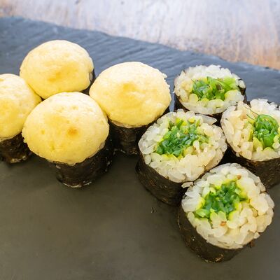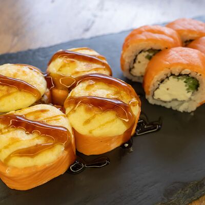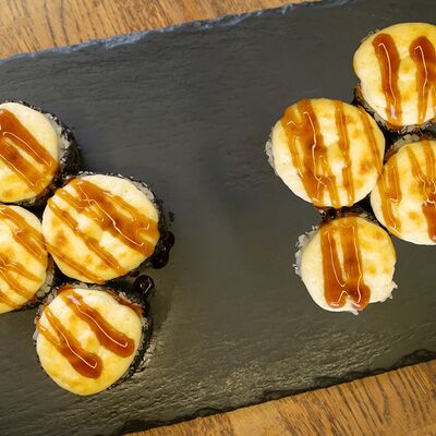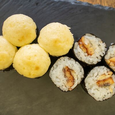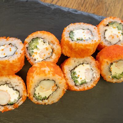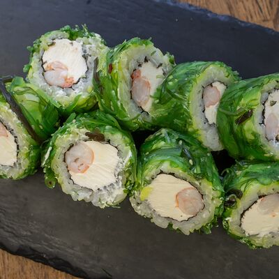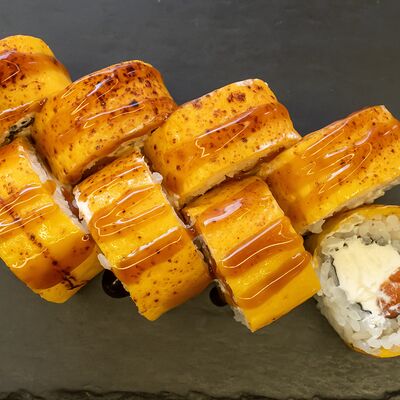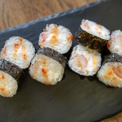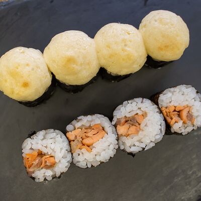 Рис, тунец, водоросли нори, сыр творожный, пекинская капуста, шиитаке, смесь темпура, панировочные сухари, соус терияки