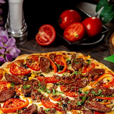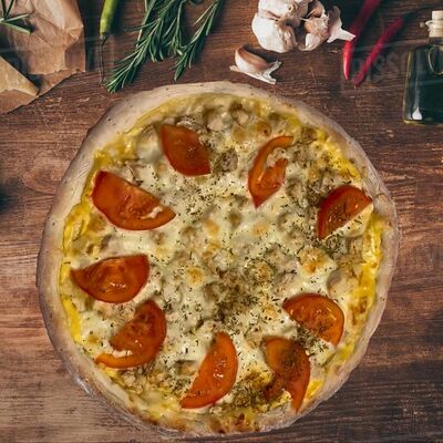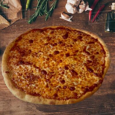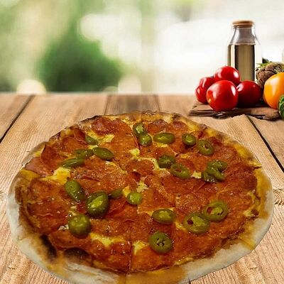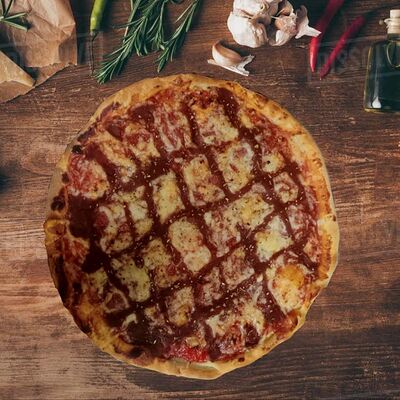Томатный соус, сыр мацарела, баварская колбаса, перец халапеньо, соус барбекю, орегано, базилик (30 см)