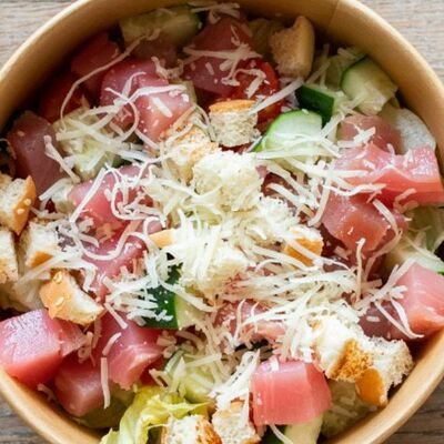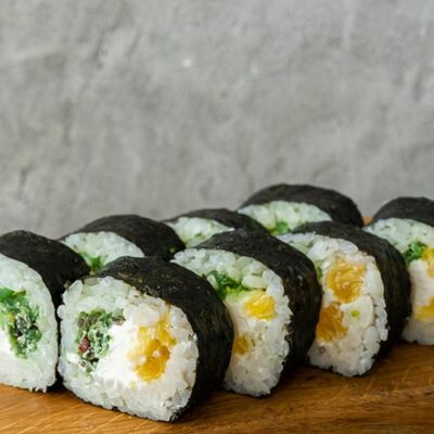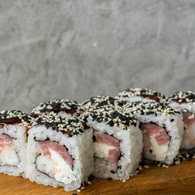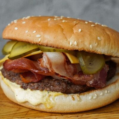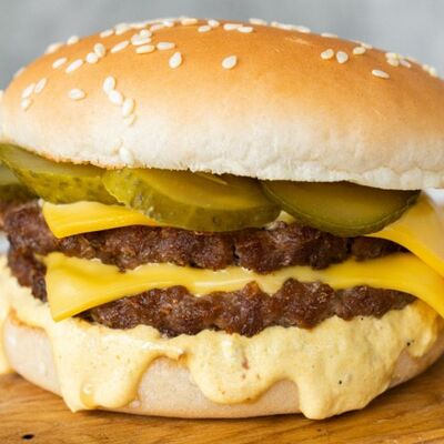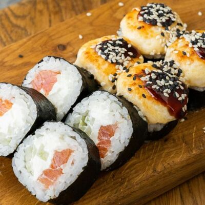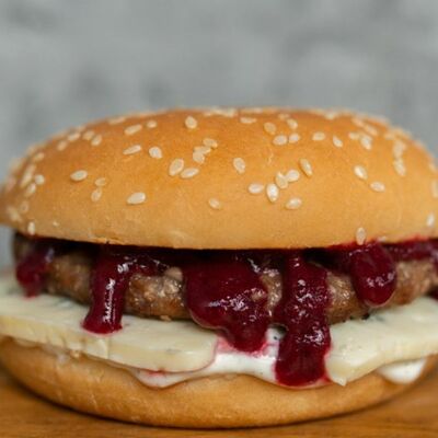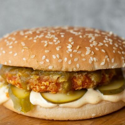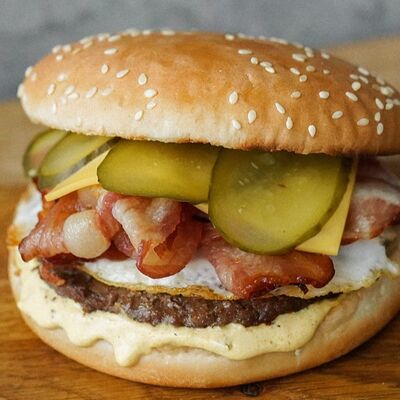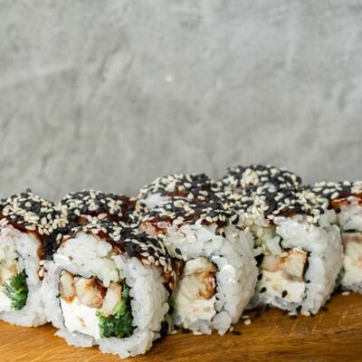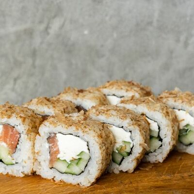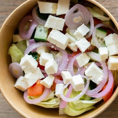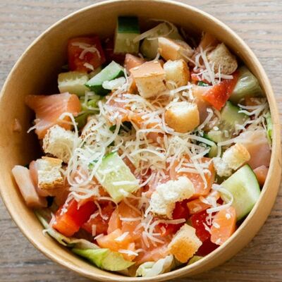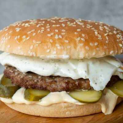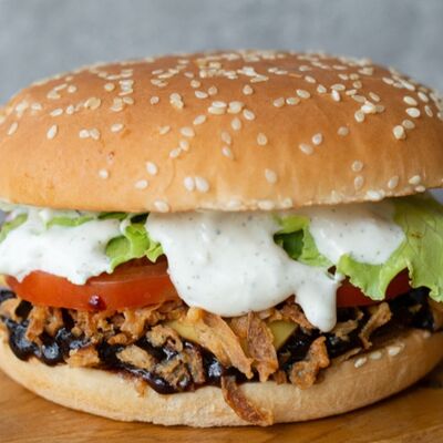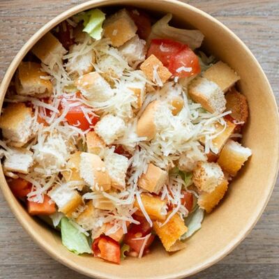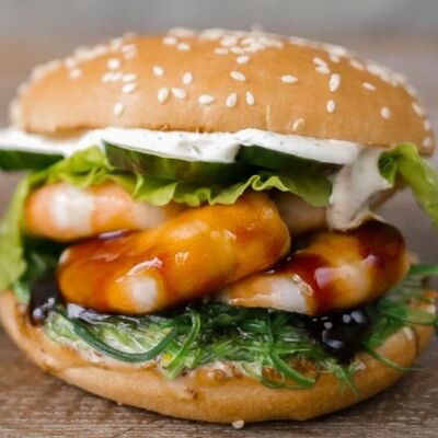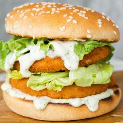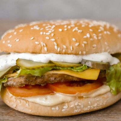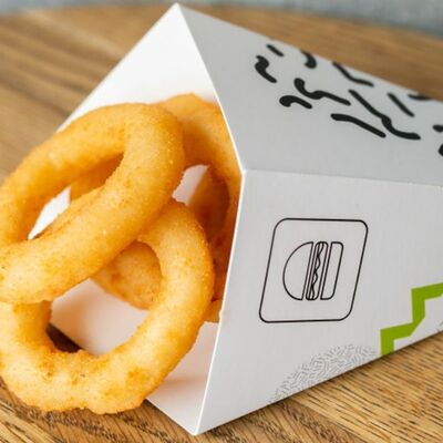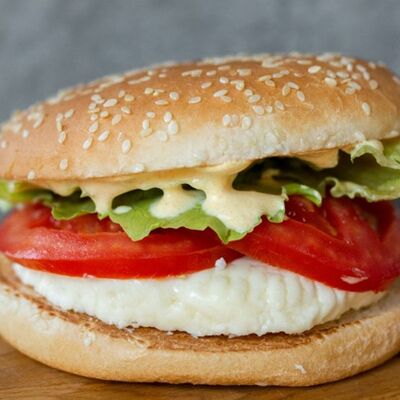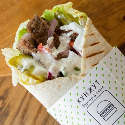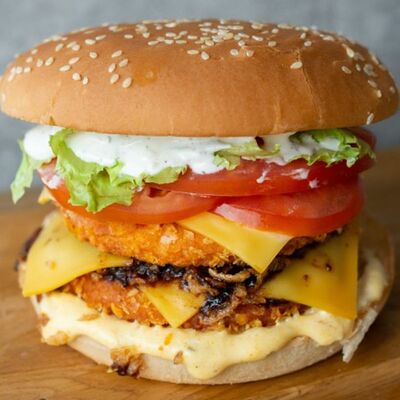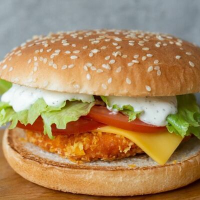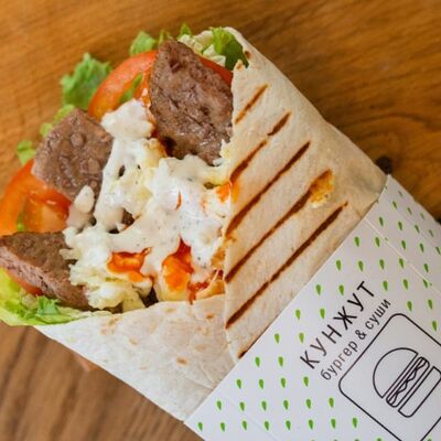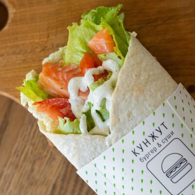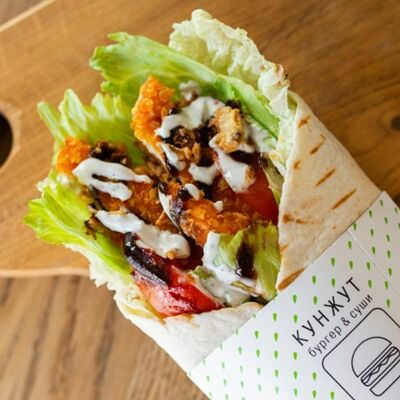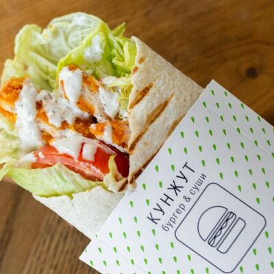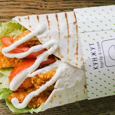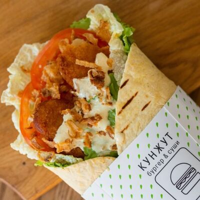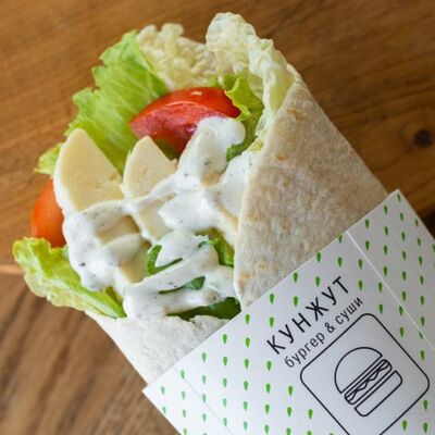 Куриное филе, помидор, свежий салат, хрустящие луковые хлопья, сырная тортилья, сырный соус