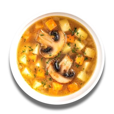 Грибной бульон, свежий картофель, репчатый лук, свежая морковь, перловая крупа, грибы шампиньоны, сметана, зелень