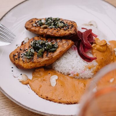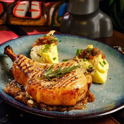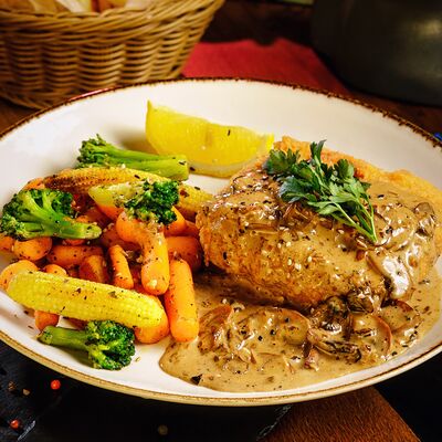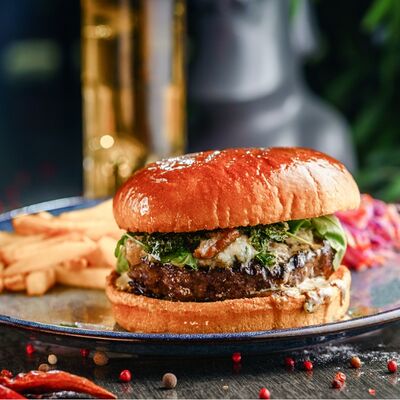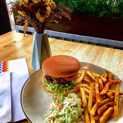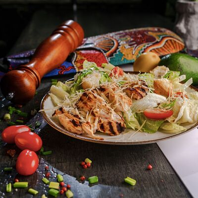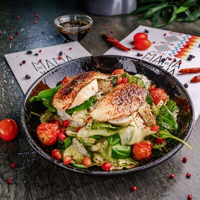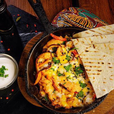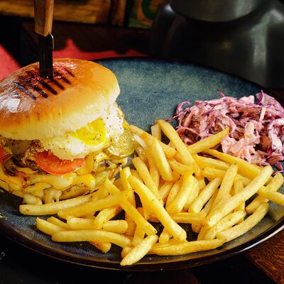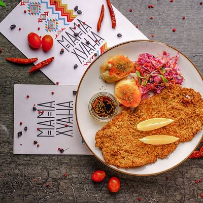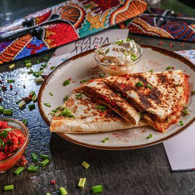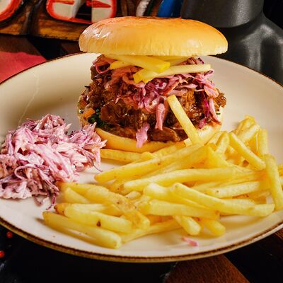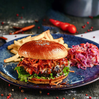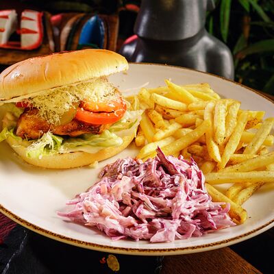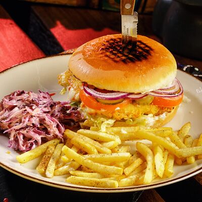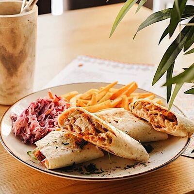 Тортилья с куриным филе в панировке, томатами, салатом айсберг, маринованным огурцом, соусом тысяча островов и черничным джемом. Подается с картофелем фри и салатом коул слоу