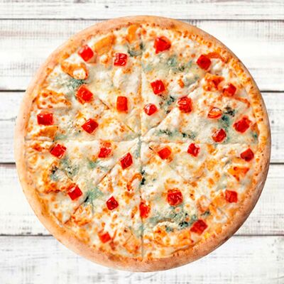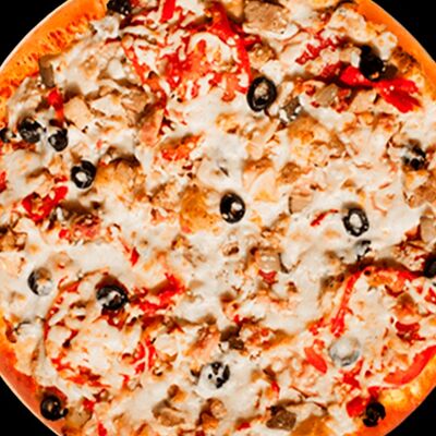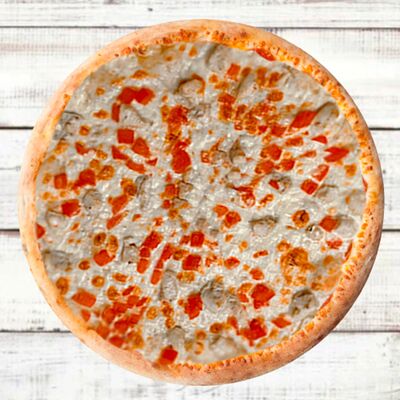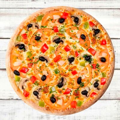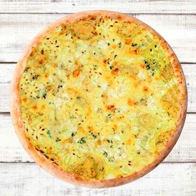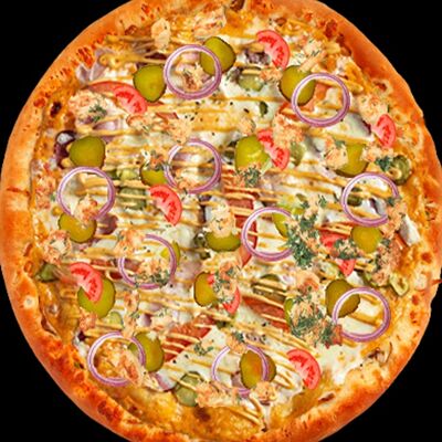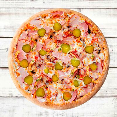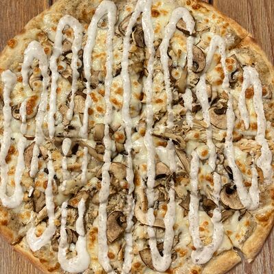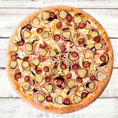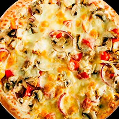 Основа чесночная, грибы, курица, помидор, яйца, прованские травы, моцарелла, огурец маринованный, соус грибной (30 см)