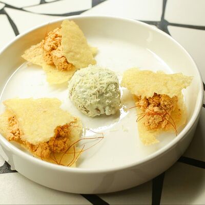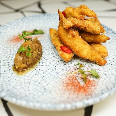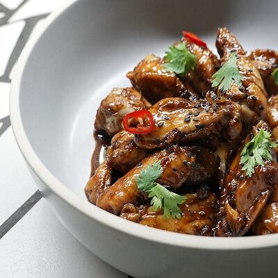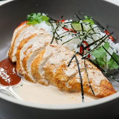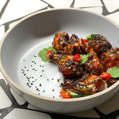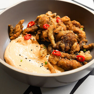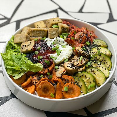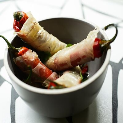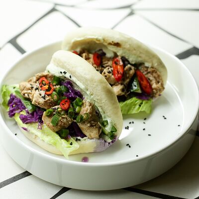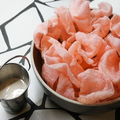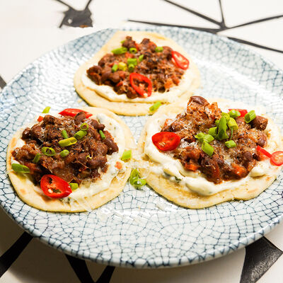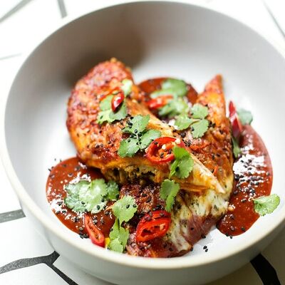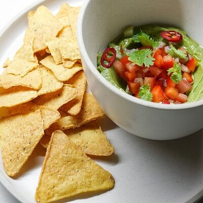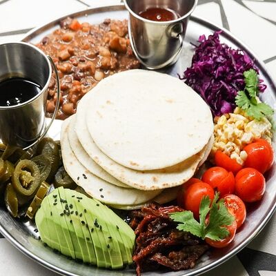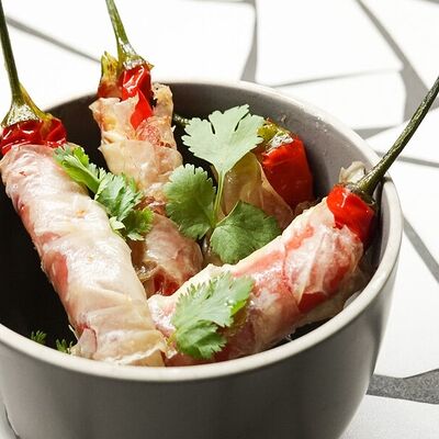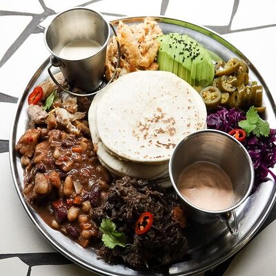 Пшеничная лепешка, маринованная красная капуста, авокадо, маринованные халапеньо, куриное филе, свиная грудинка, говяжьи щёки, острый соус пири-пири, соус сырный, овощное чили