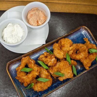 Креветка, салат, помидоры, сыр, яйца, гренки, соус