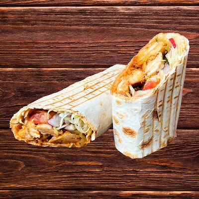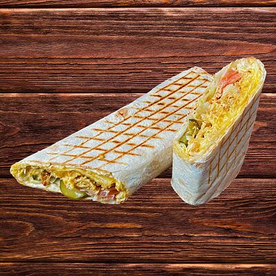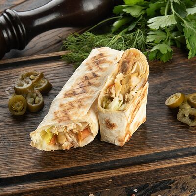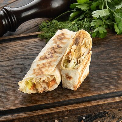 Лаваш, соус чесночный, шинкованная капуста, куриное филе, соленые огурчики, свежие томаты, соус Цезарь