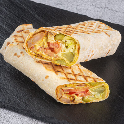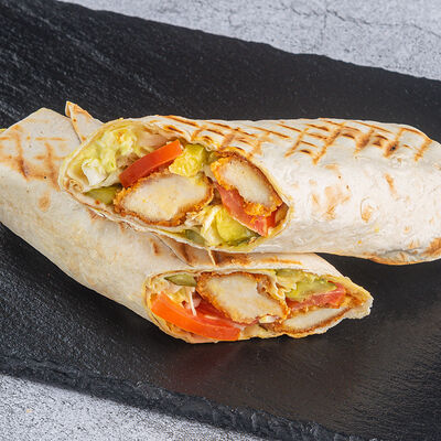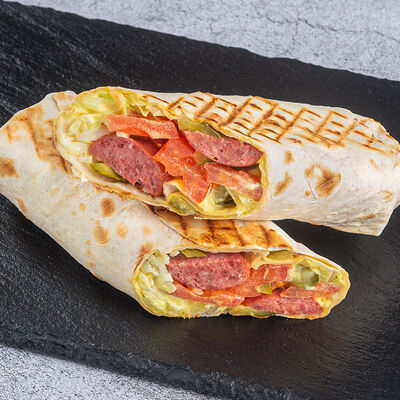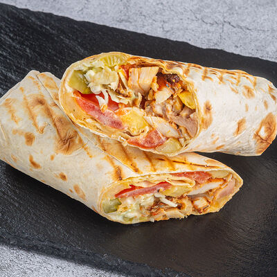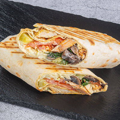 Лаваш, куриное филе, капуста, томат, свежий или соленый огурец, фирменный соус