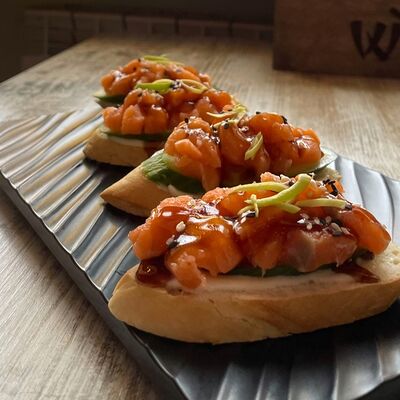 Брускетта, лосось, сыр, огурец, лук-порей, соус унаги
