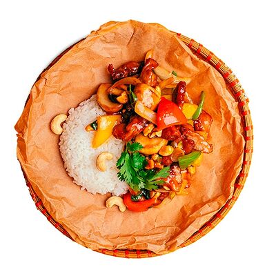 Рис, курица, кешью, перец болгарский, лук, кинза, авторский соус